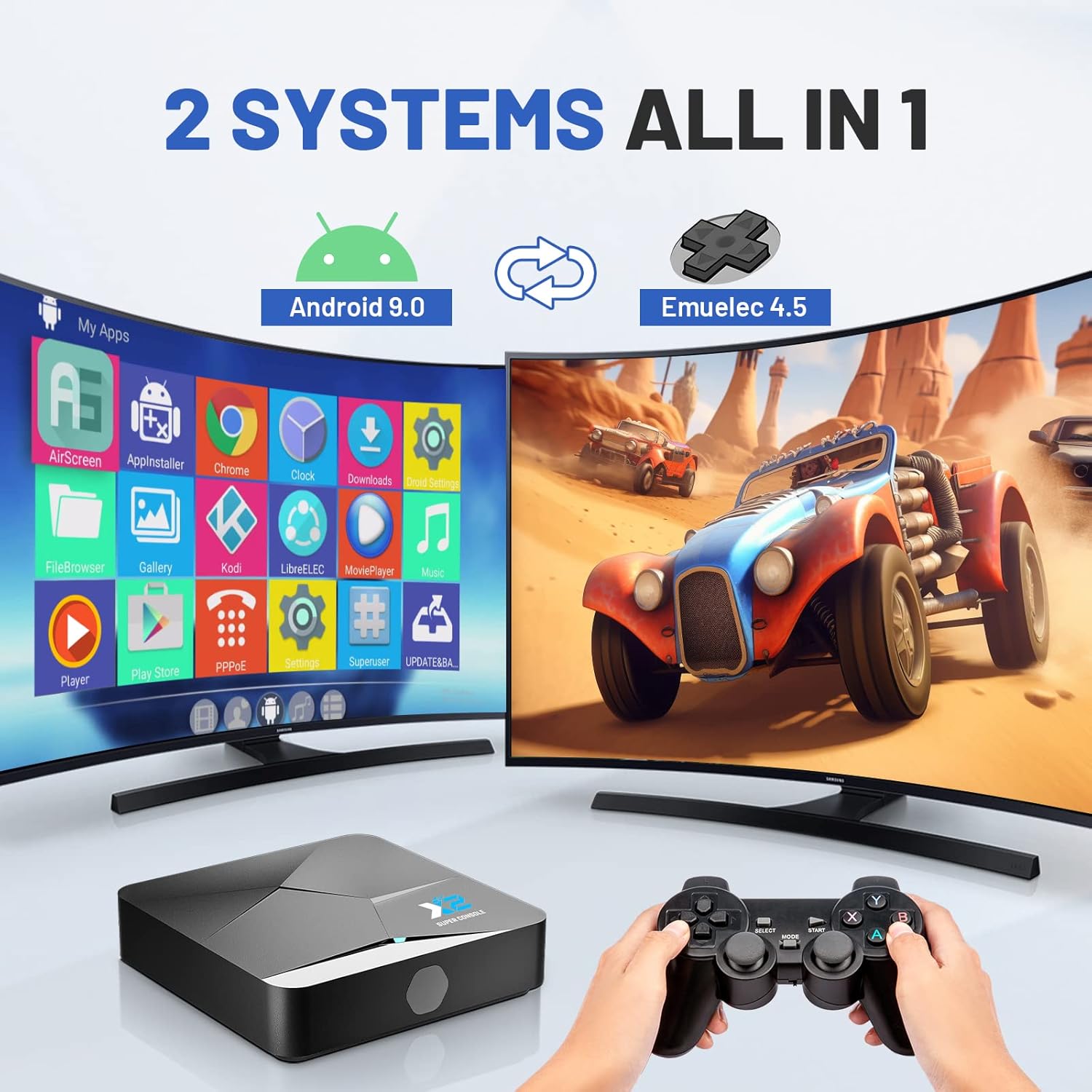 【2 Systems in 1】Equipped with the latest EmuELEC4.5 game system and Android TV system, You can use it to watch online TV and play video games. The remote controller can switch between the TV system and the game system.