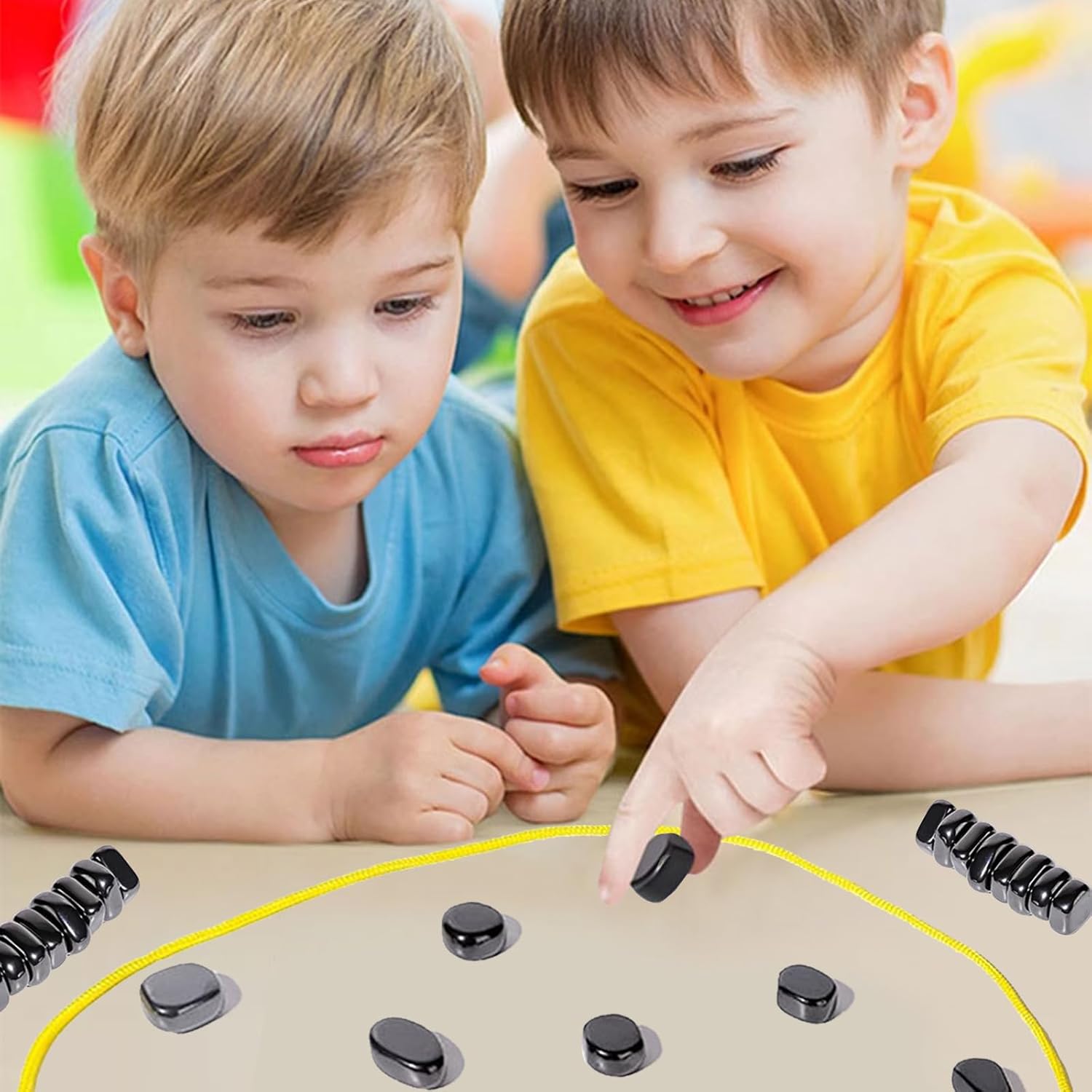 The objective is to get rid of your magetic stones by taking turns placing your magnets inside the rope. If there are any magnets when it’s your turn, pick them up!