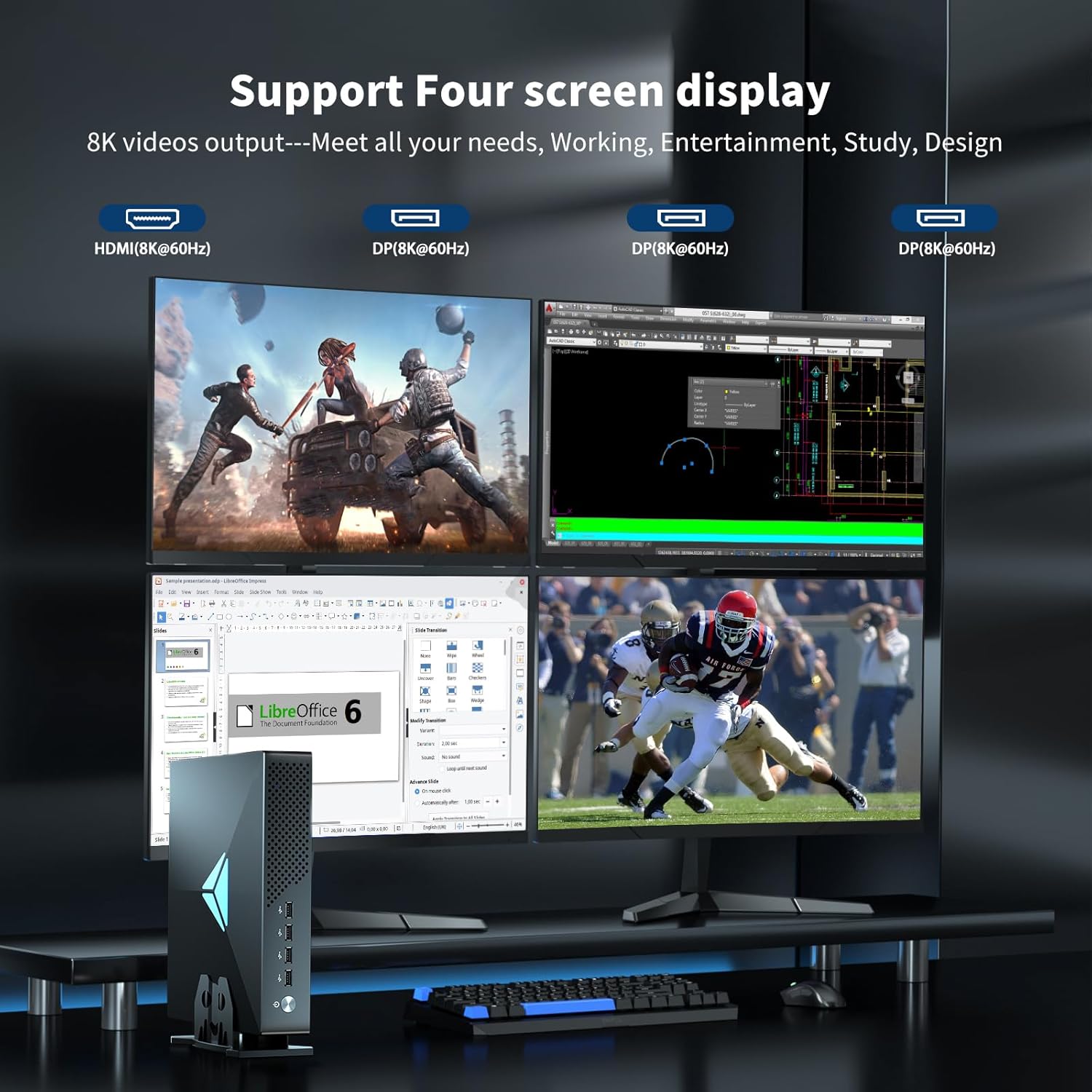 [Functional Interfaces] Mini computer is equipped with 4 x USB 2.0, 4 x USB 3.0, 1 x HDMI port, 3 x DP ports, 1 x Type-c port, 1x RJ-45 Gigabit Network Ethernet, 1 x Audio in/out. Built-in Bluetooth 5.3 and 802.11AX wifi 6E, Increase transmission distance and signal stability. Mini PC supports multiple device connection and can be used with servers, monitoring equipment, office equipment, projectors, etc, Mini desktop computer support Automatic Power On and Wake On Lan.