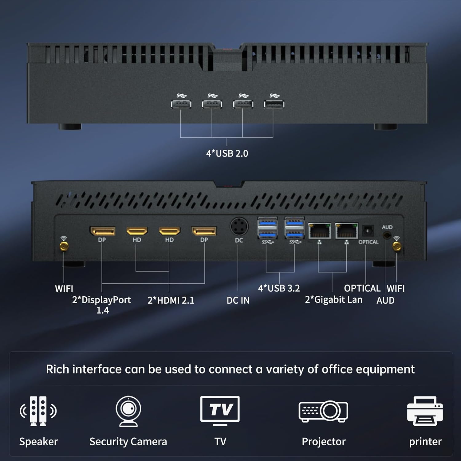 [Functional Interfaces] Mini computer is equipped with 4 x USB3.2, 4 x USB2.0, 2 x HDMI ports, 2 x DP ports, 2xRJ-45 Gigabit Network Ethernet, 1 x Fiber Optic PORT, 1 x Audio in/out. Built-in Bluetooth 5.3 and 802.11AX wifi 6E, Increase transmission distance and signal stability. Mini PC supports multiple device connection and can be used with servers, monitoring equipment, office equipment, projectors, televisions, etc, Mini desktop computer support automatic power on and Wake On Lan.