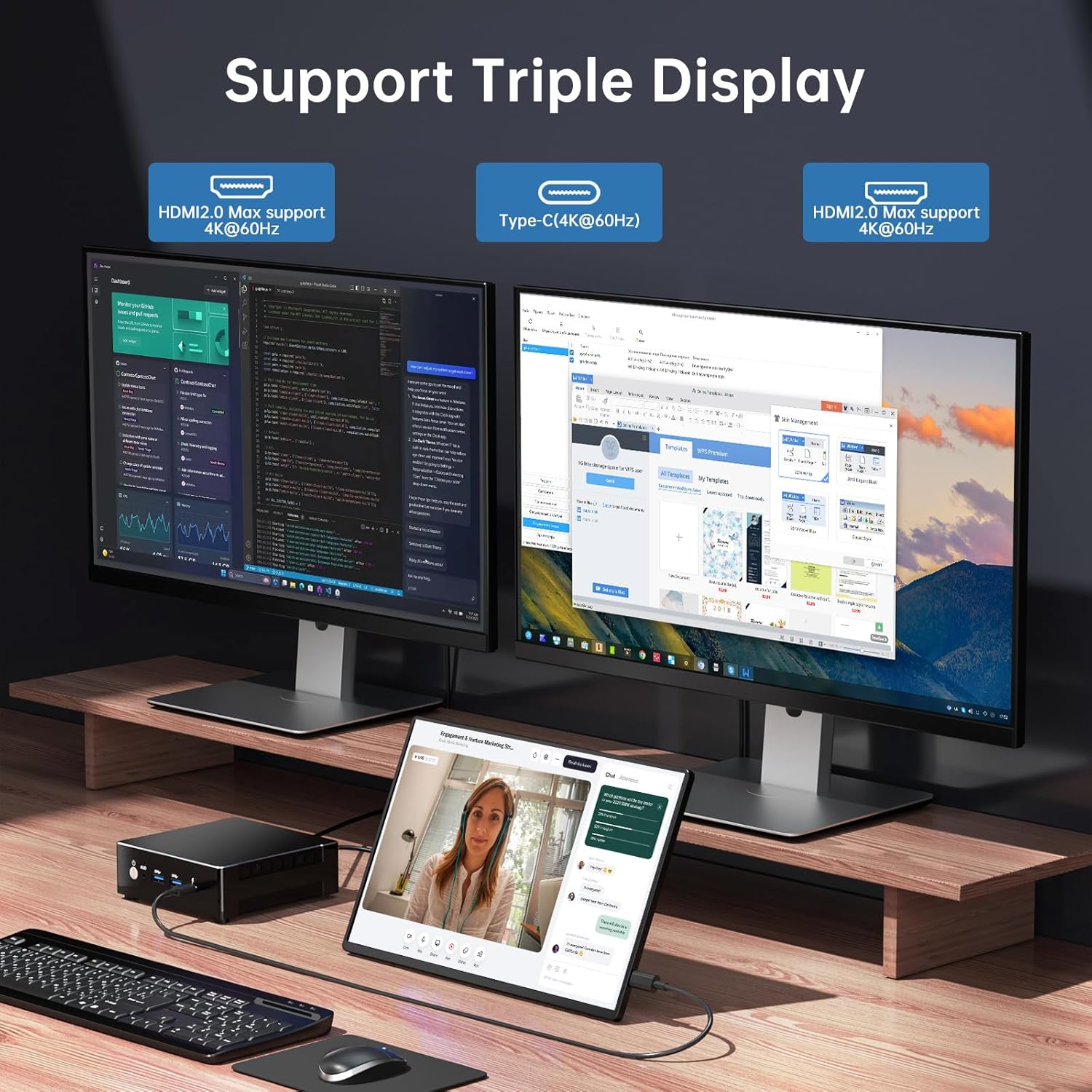 [4K@60Hz Triple Display] Featuring the built-in AMD Radeon 780M 12core 2800MHz GPU. Mini PC supports easy connection to three-monitors via 2 x HDMI2.0+USB-C, Support 4K@60Hz HD output, Radeon 780M delivers powerful graphics processing. It can give you an immersive, lifelike picture quality experience, more efficient, comfortable productivity. Mini PC supports Auto Power On, Wake On Lan.