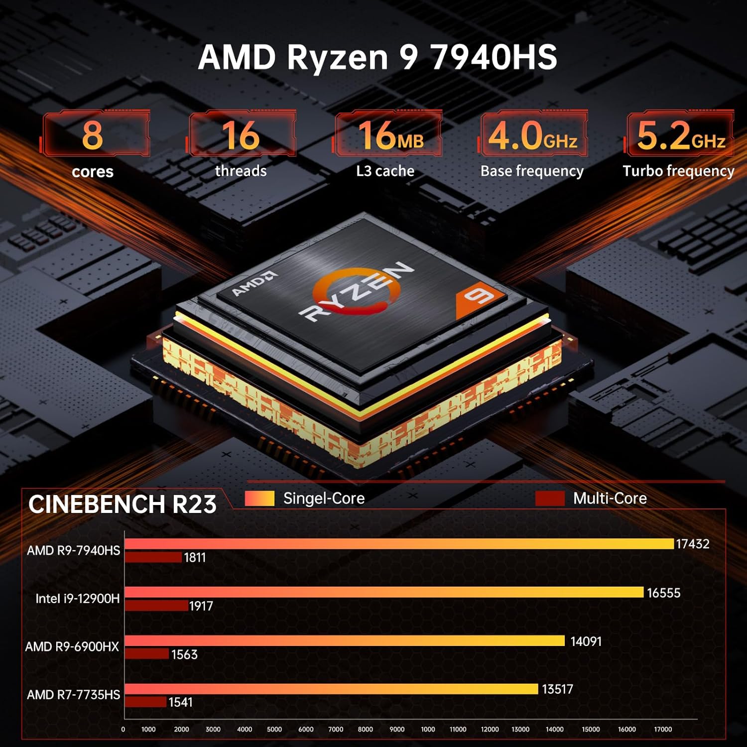 [High Performance] Mini PC equipped with AMD Ryzen 9 7940HS, 8 cores 16 threads, 16M smart L3 Cache, base frequency: 4.0GHz, max 5.2GHz. The process rule has improved from the previous generation of 7nm to 4nm, with “Zen 4” architecture, Pre-installed with Windows 11 Pro (64bit) OS, the computer can handle heavy computing tasks smoothly and better for multitasking. Built-in Intel AX210 WiFi6E, Bluetooth 5.3. Mini PC is ideal for such as Programming, Design, Office, Education, Gaming, etc.