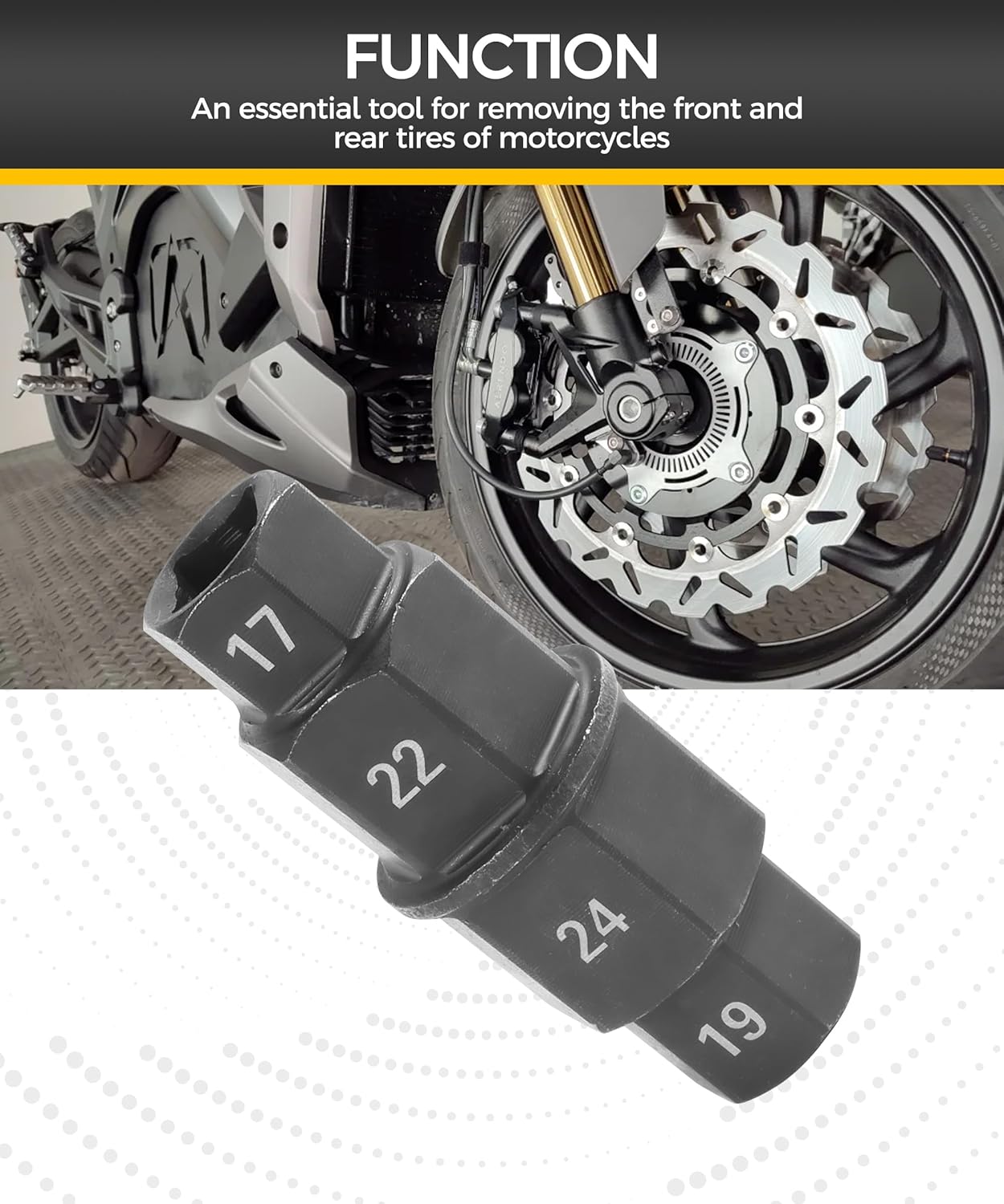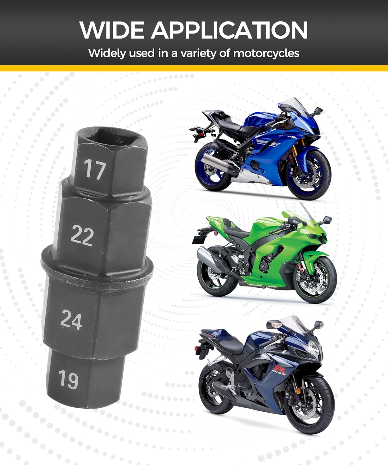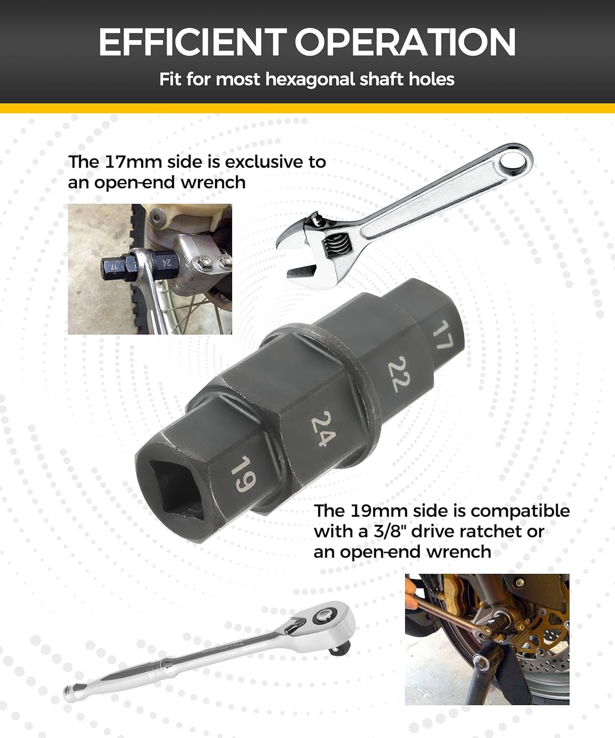 [Four Sizes] The motorcycle front axle removal tool contains four metric hexagonal sizes: the sizes include 17mm, 19mm, 22mm and 24mm. The 19mm side can be used with a 3/8-inch drive ratchet or open-end wrench, and the 17mm side can only be used with an open-end wrench.