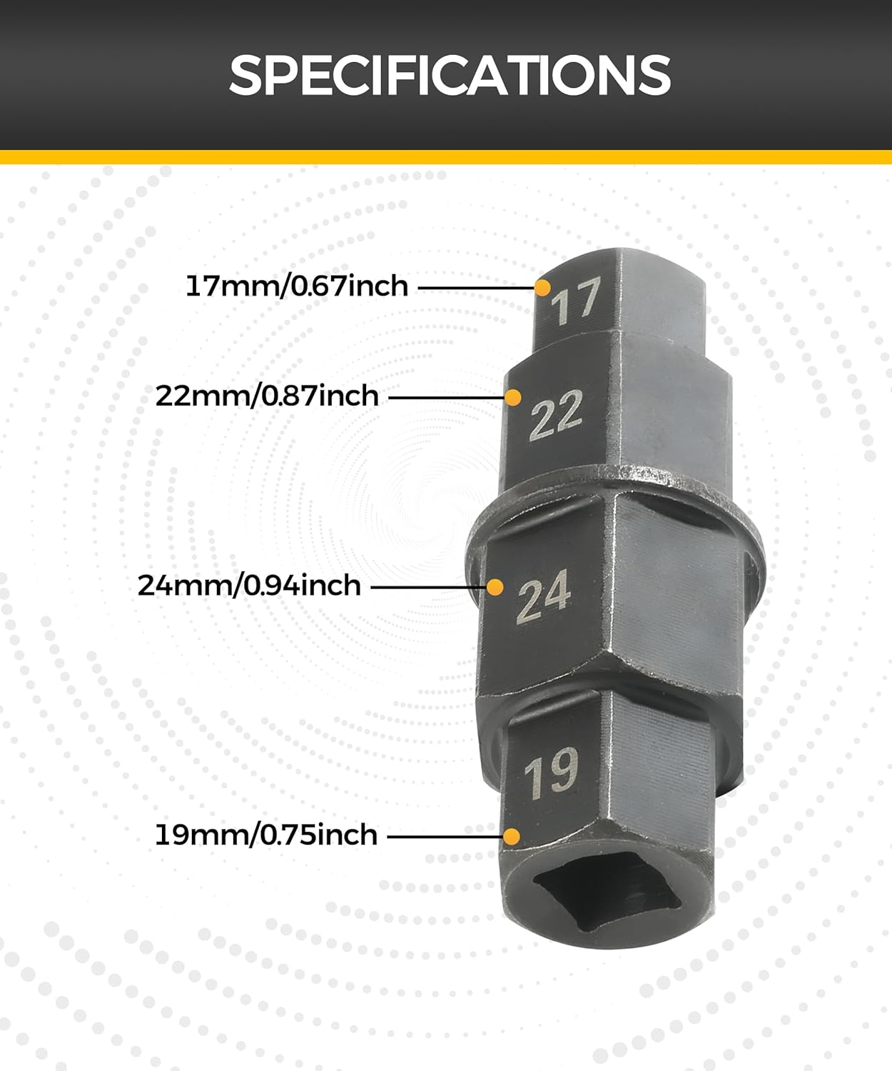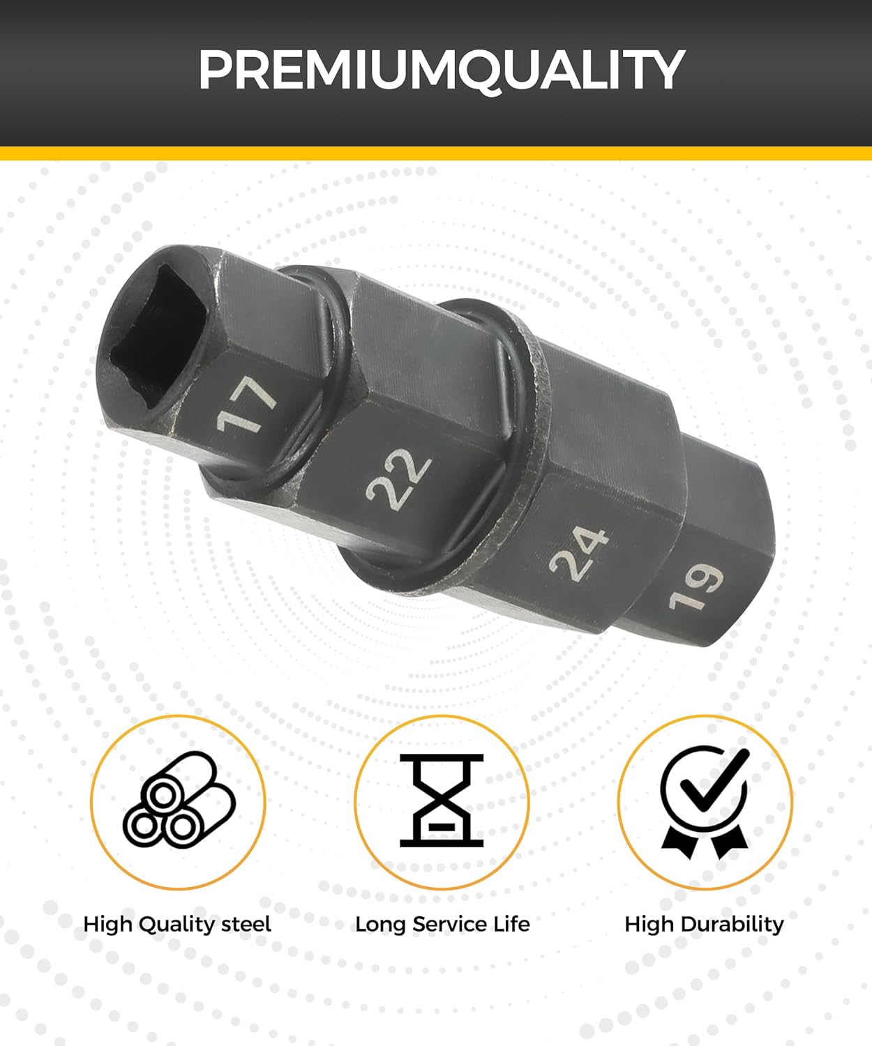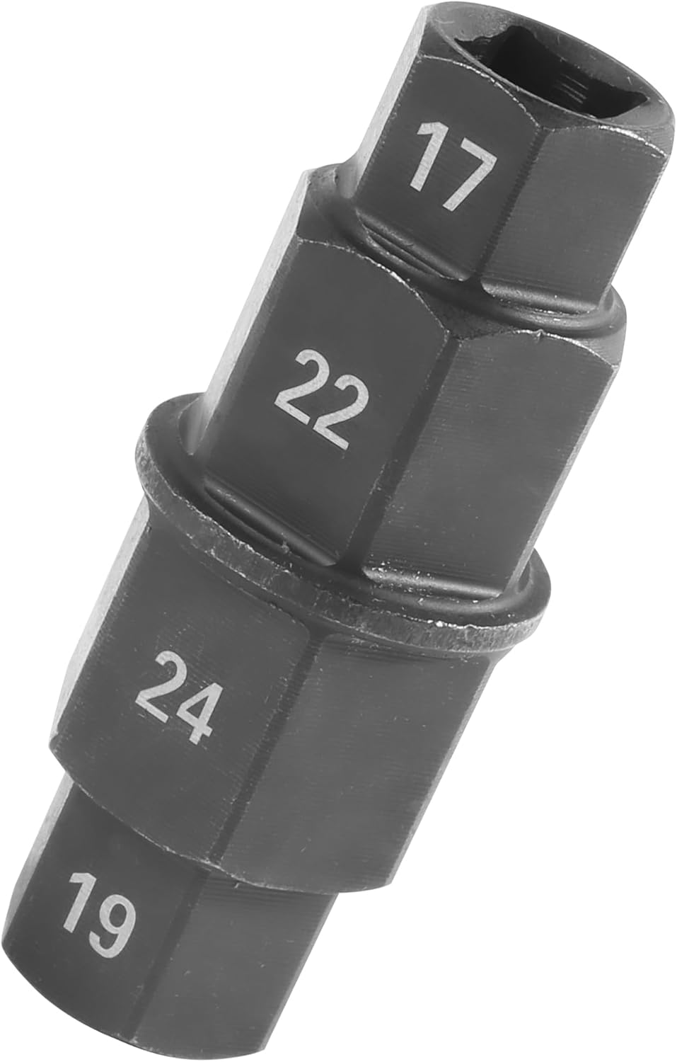 [Four Sizes] The motorcycle front axle removal tool contains four metric hexagonal sizes: the sizes include 17mm, 19mm, 22mm and 24mm. The 19mm side can be used with a 3/8-inch drive ratchet or open-end wrench, and the 17mm side can only be used with an open-end wrench.