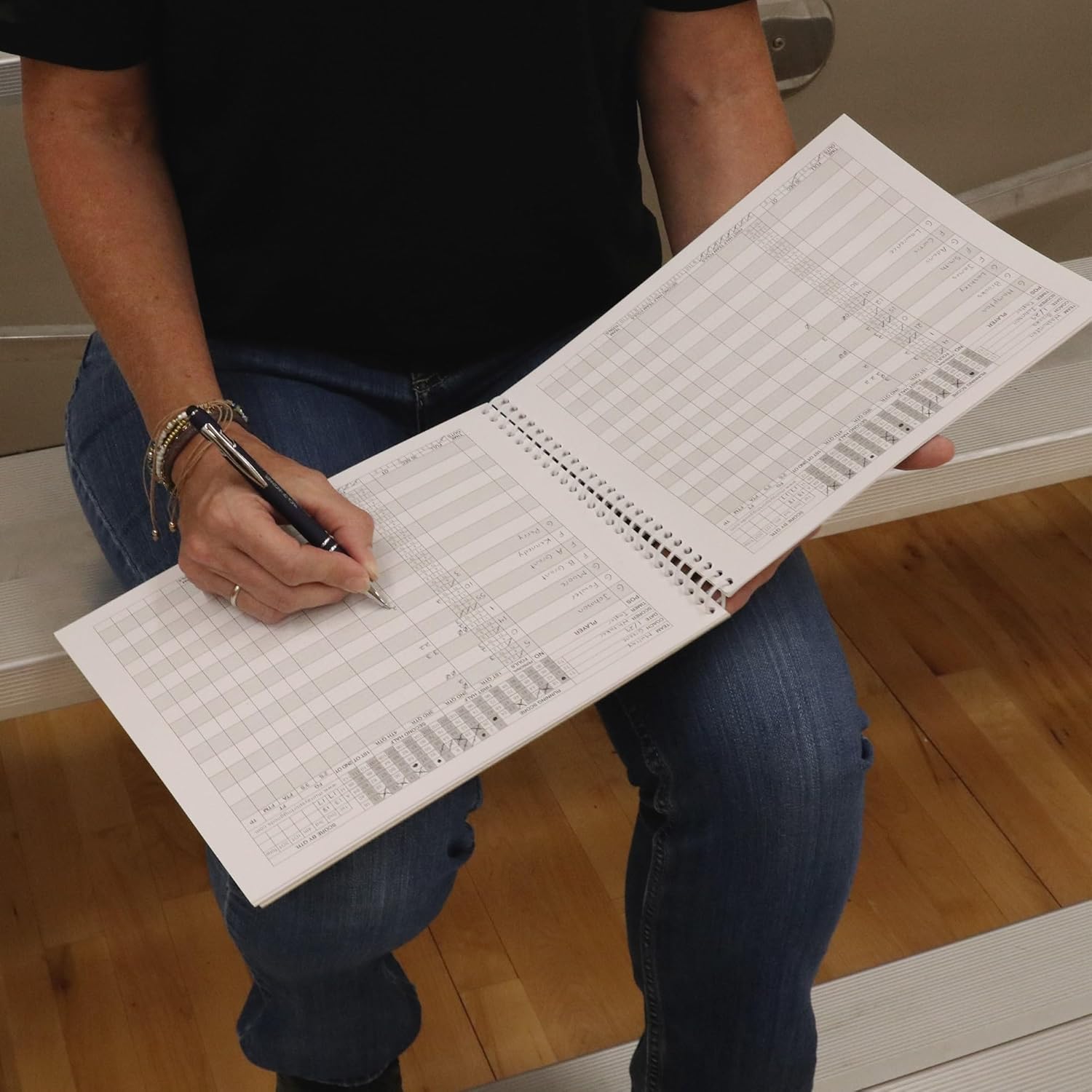 Spiral Bound Side-by-Side Scorekeeping Book: log score and stats for both home and away teams without having to flip through pages. Simply close the score keeper book – one side for the home team and the other side for the away team.
