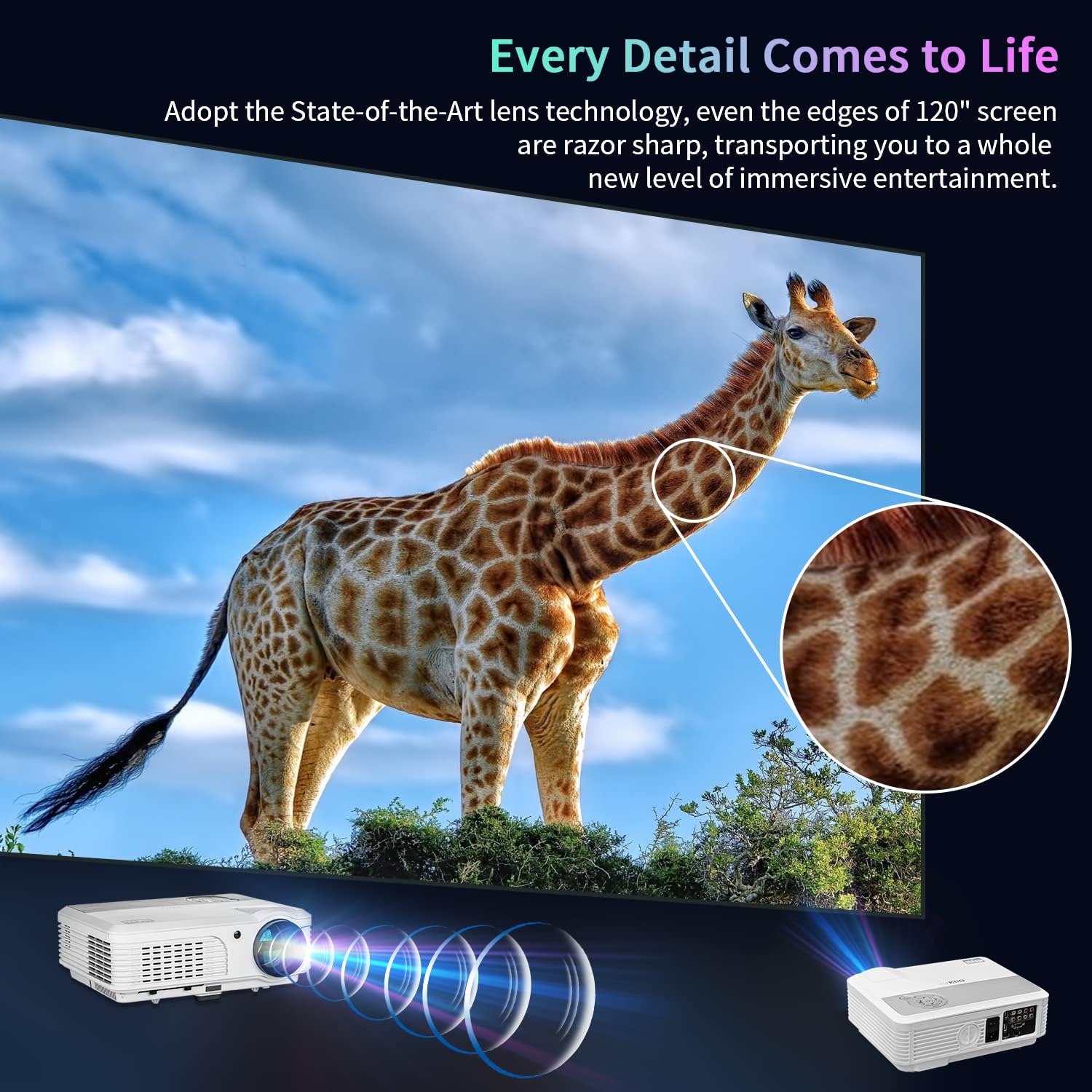 【7500 Lumens,7500:1 and 50,000 Hours Life】Multi-layer optical film and high-quality glass are used to reduce reflection and increase light transmission, allowing this video projector to display clearer images. True 7500 lumens and 7500:1 high dynamic contrast ratio make images more vivid and sharp, ensuring the best video experience. With advanced temperature control technology, it minimizes power consumption and extends lamp life to 50,000 hours. Saves you money and hassle in the long run.
