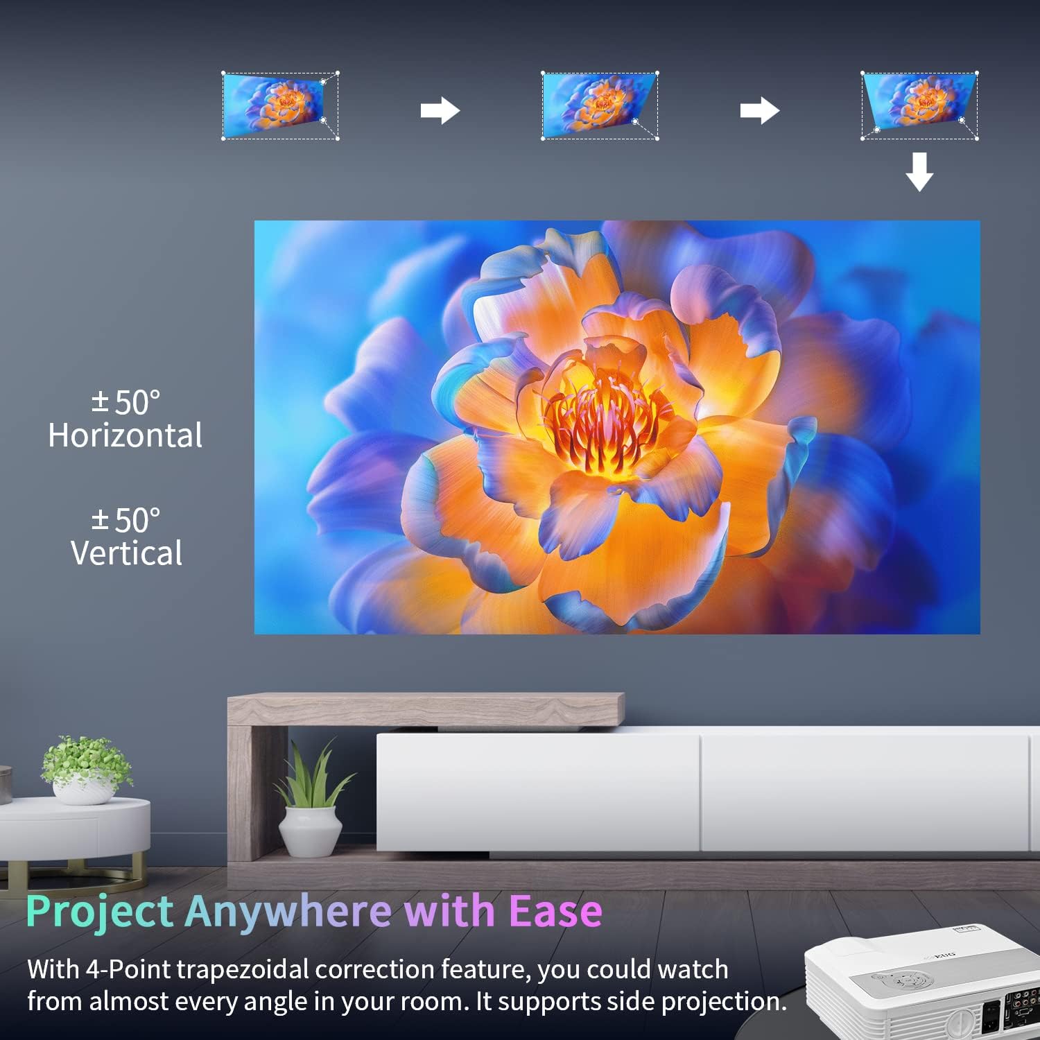 【4D/4P Keystone Correction and 200″ Giant Screen Display】Equipped with 4D/4P keystone correction, you can adjust the screen independently from the four corners or vertically, horizontally and rotationally, making it easy to get it no matter how you place it Square image home projector. The adjustable 50″-200″ screen display also gives you the freedom to customize the screen size to fit any space. It can be easily mounted on a stand or hung from the ceiling.