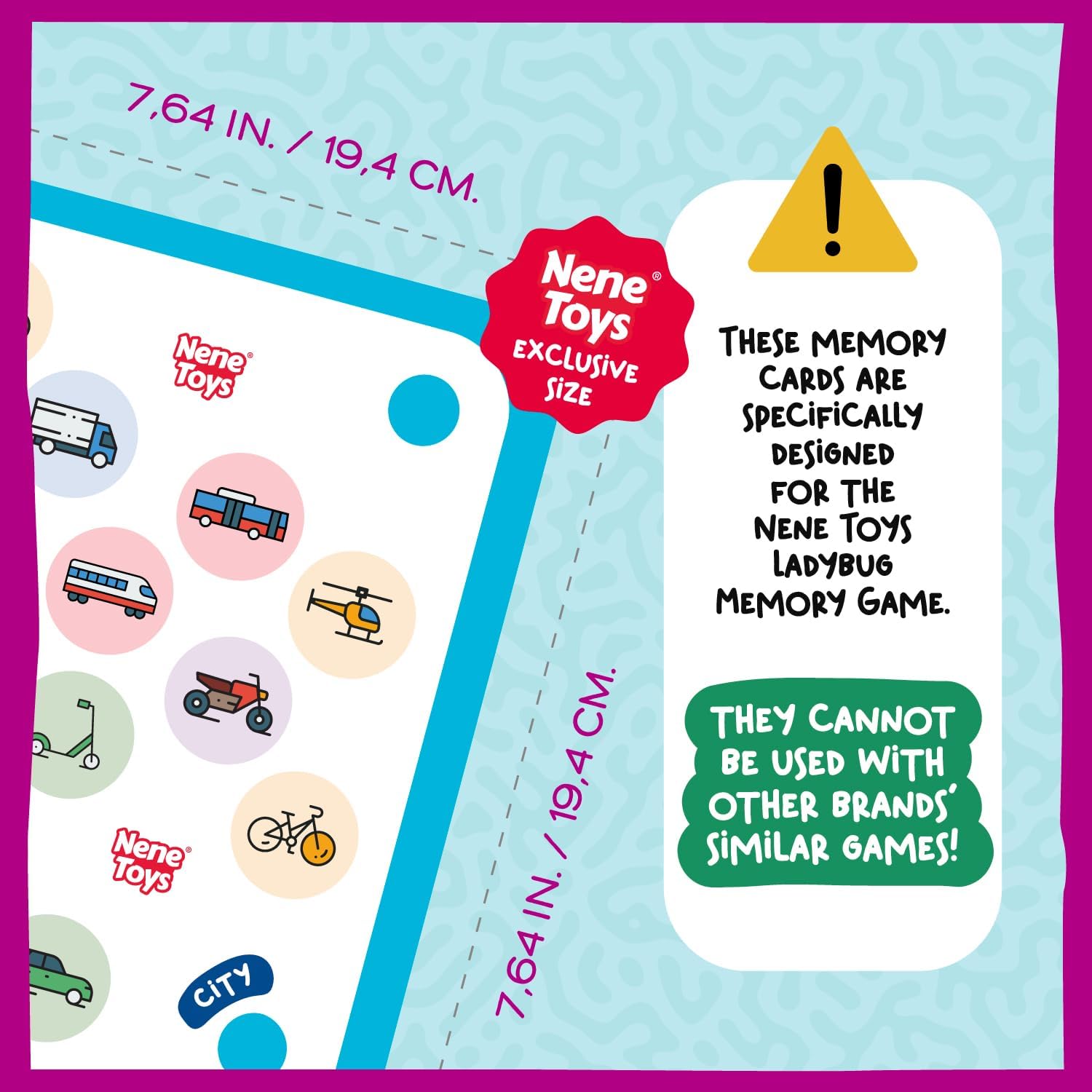 ⚠️ EXCLUSIVELY SIZED FOR NENE TOYS: These memory cards are a unique size, specifically designed for the Nene Toys Ladybug Memory Game. Measuring 7.64 inches x 7.64 inches (19.4 cm x 19.4 cm), they cannot be used with other brands’ similar games!