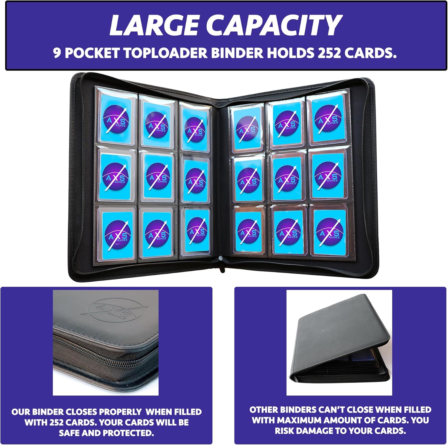 Proper Capacity: Our 9 Pocket Toploader Binders hold 252 Regular 3” x 4” Top loaders. Any more than that and the binder doesn’t close properly and gets too full. Our Top Loader Binder’s size is 15”L x 13”W x 2”H, The binder is super padded on the outside, to be comfortable to touch.