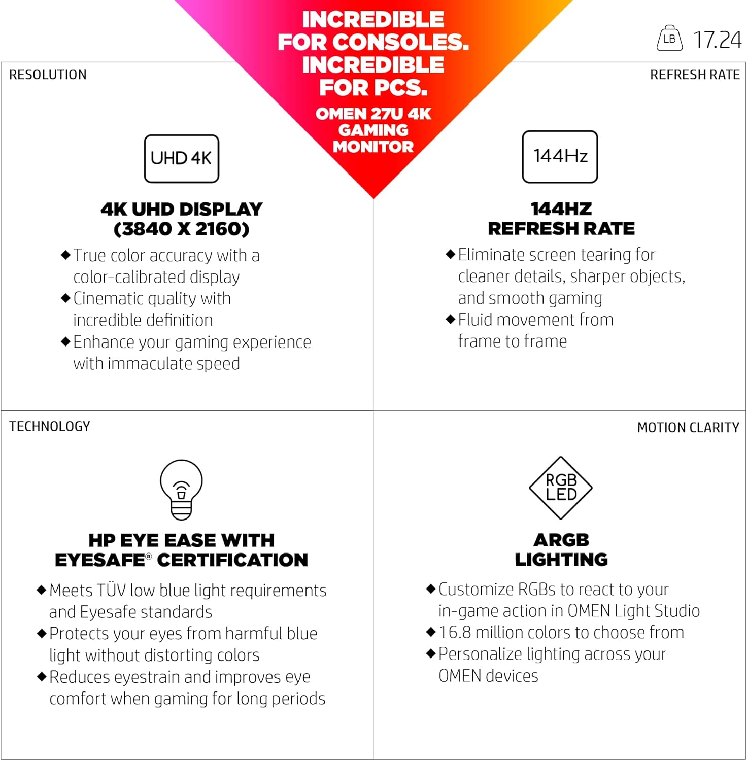 Unlock your consoles’ true potential with the new OMEN 27u 4K Gaming Monitor. Gorgeous color and immaculate speed of a 4K performance gaming monitor that can now be played on a PC or on the latest gen consoles via HDMI 2.1. Customize every aspect of your game with OMEN Gaming Hub. This monitor comes with a power cord, adapter, DisplayPort 1.4 cable, USB 3.2 Gen 2 AM-CM cable, quick setup guide and document kit. Plus, HP is innovating new ways to reduce the amount of materials in our packaging and to use more recycled materials in the design. This monitor is protected by a 1-year HP limited warranty. Certain restrictions and exclusions apply. 100% outer box packaging and corrugated cushions made from sustainably sourced certified and recycled fibers. Fiber cushions made from 100% recycled wood fiber and organic material.