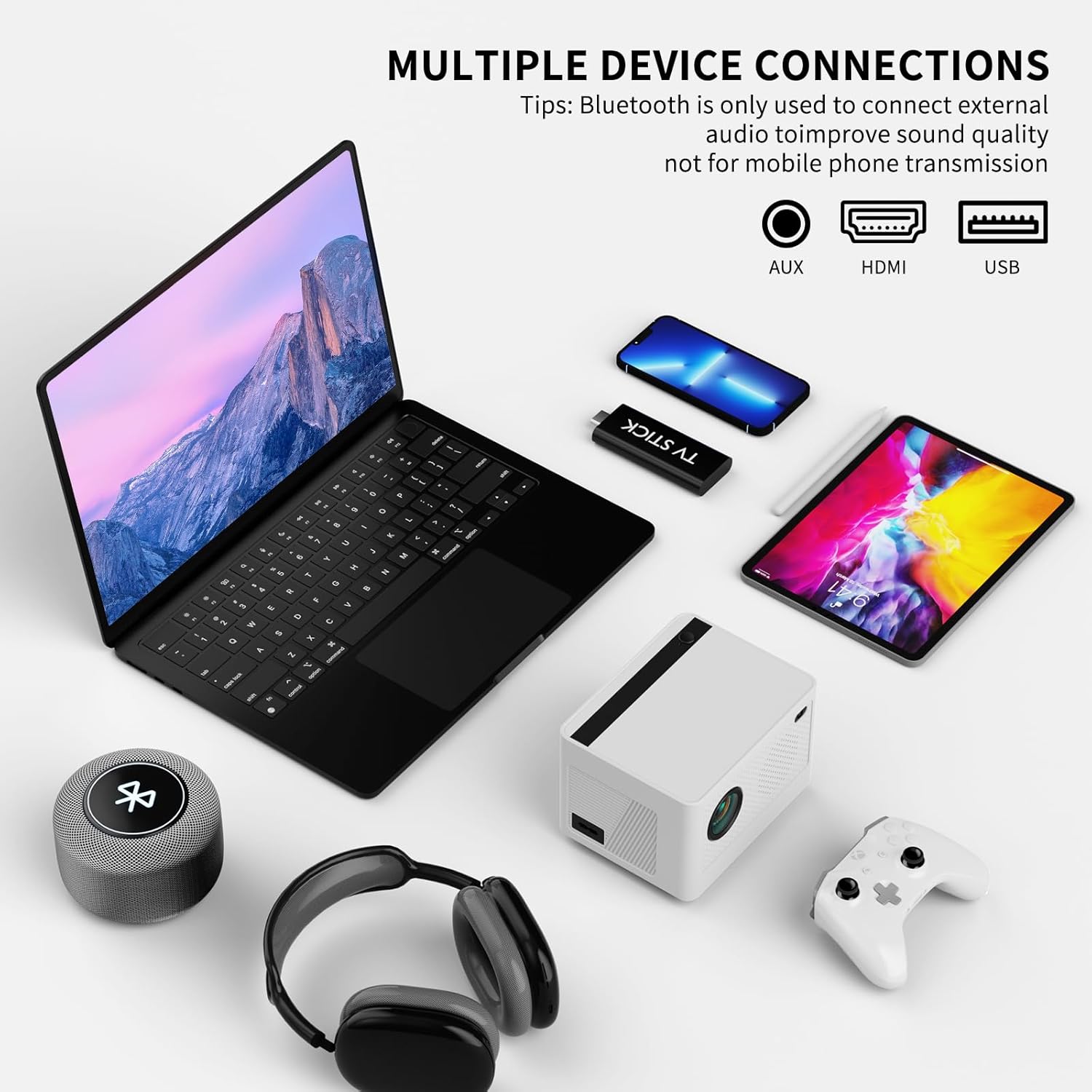 ★【5.8G/2.4G WiFi & Bluetooth 5.2 Supported】The home projector is equipped with 2.4G/5.8G dual-band WiFi, which has wider coverage and faster speed. You can easily connect to your smartphone/tablet via 5.8G WiFi with more stable and smooth images and no game lag. By connecting newest built-in 5.2 Bluetooth, allows you to connect Bluetooth headphones/speakers/AirPods more stably, mini bluetooth projector equipped with 5W Stereo Speakers, the 360° surround sound takes you to your movie night.