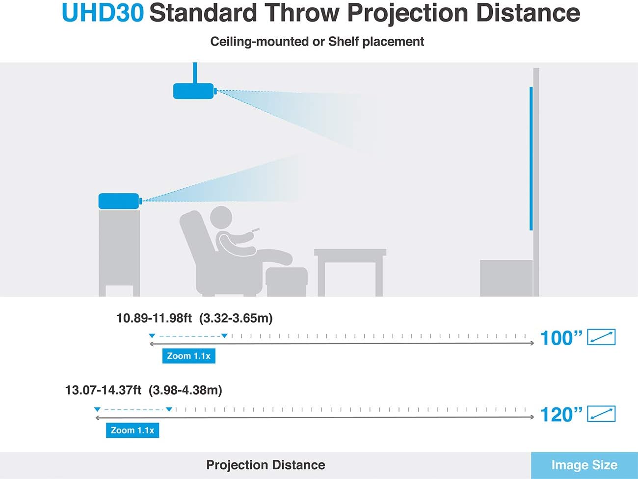 STANDARD THROW PROJECTION: Project a 100″ image from approximately 11 feet away; project a 120″ image from approximately 14 feet away; UHD30 projects up to a 302″ image
