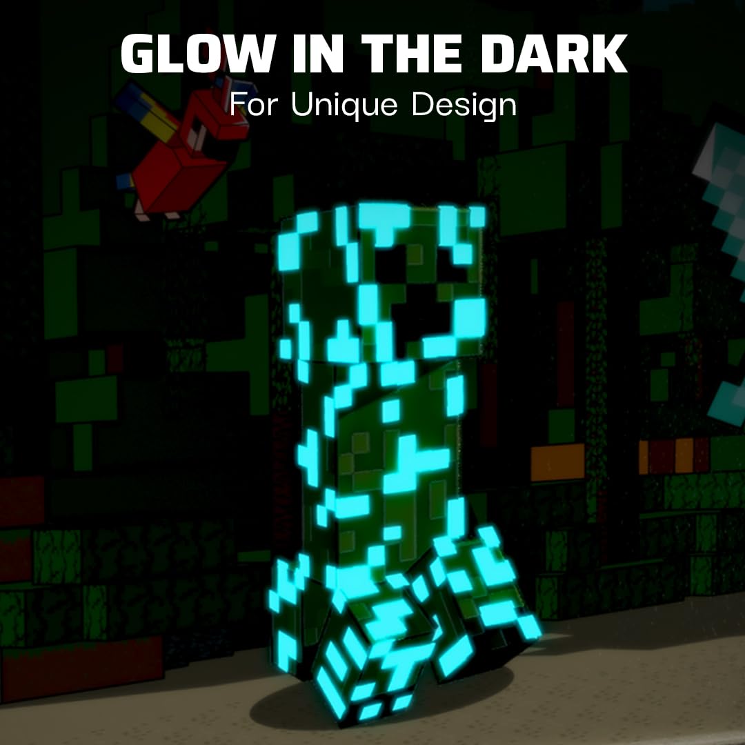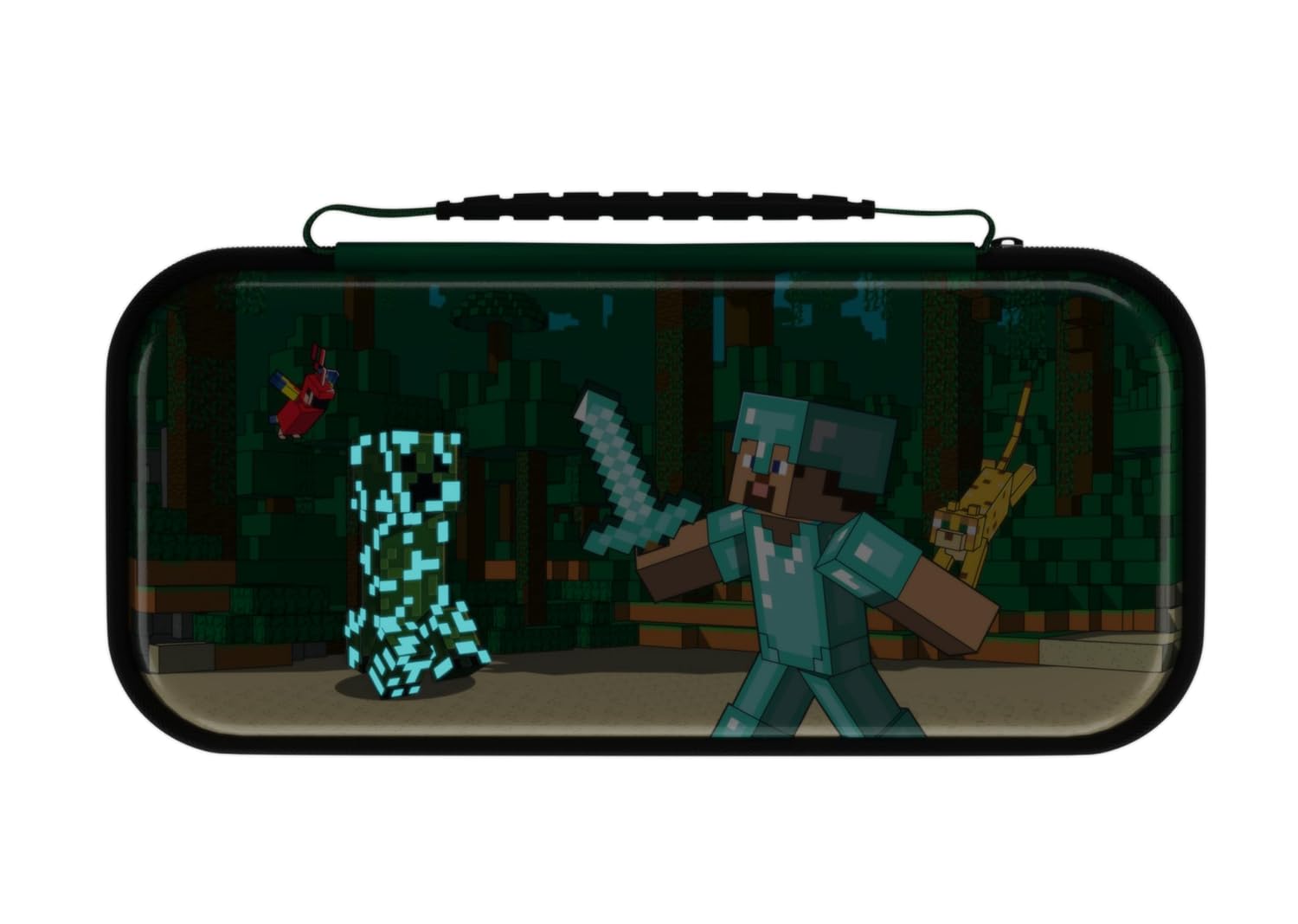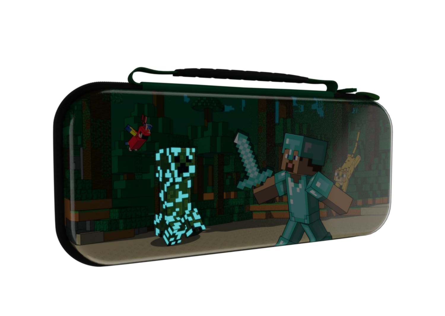 Explore the realm of possibilities with the Minecraft Forest Battle REALMz™ Travel Case Plus GLOW. Get immersed in the iconic artwork of your favorite games with this one-of-a-kind carrying case’s multi-layered design featuring a 3D molded character inside that glows in the dark, after exposure to light. Prop up and play your Nintendo Switch™ using the built-in device stand for comfortable gaming on-the-go. Never forget your earbuds or game cards at home again with the large and small storage pockets perfect for your gaming essentials. This strong, reliable case is cross-compatible with any of the Nintendo Switch family of devices and will keep them safe during travel. When you’re ready for your next adventure, carry the case with ease using the convenient, rubberized handle. Explore the REALMz with this uniquely immersive travel case, officially licensed by Nintendo® and Mojang Studios.