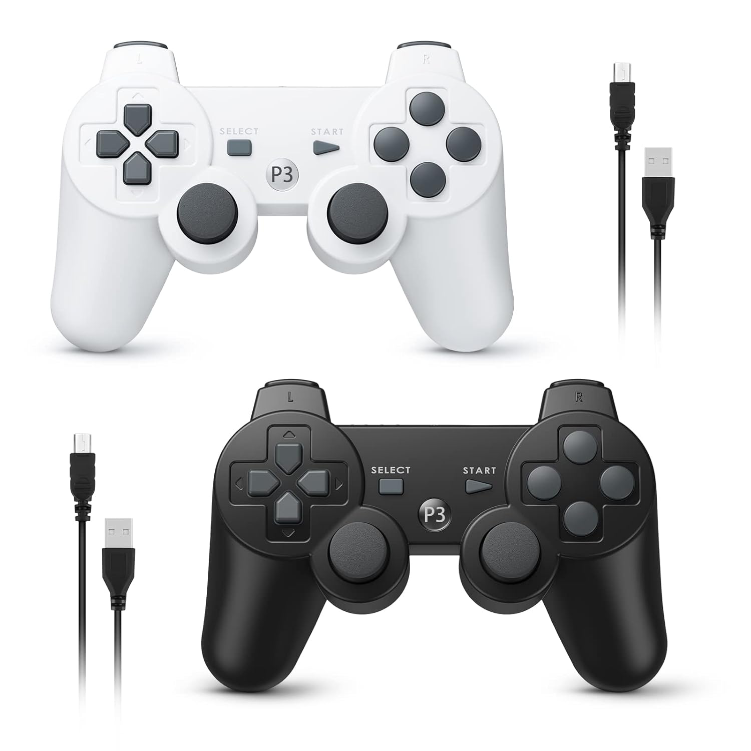 Powerextra Wireless Controller Compatible with PS3, 2 Pack Double Shock High Performance Gaming Controller with Upgraded Joystick Double Shock for Play-Station 3 (Black + White)