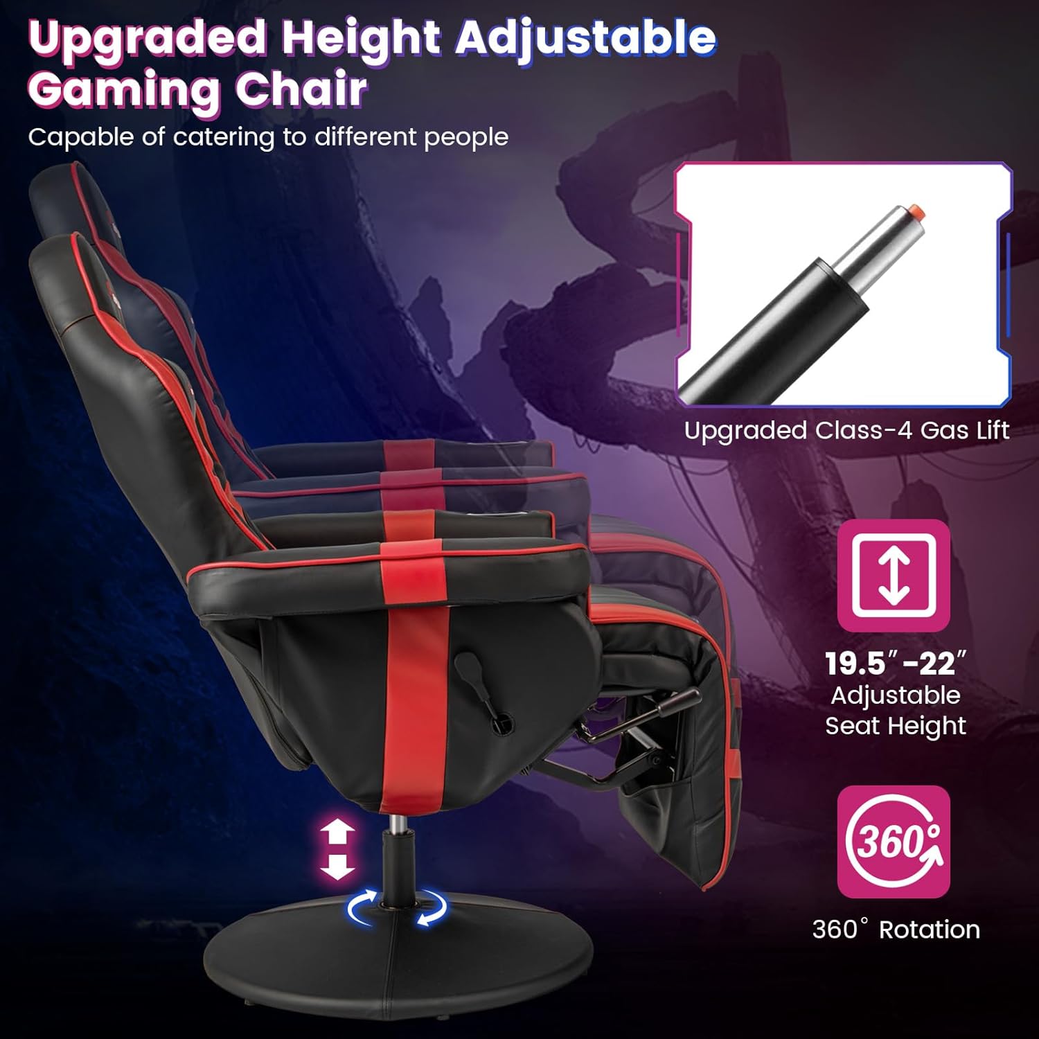 【RECLINING & HEIGHT ADJUSTABLE】Reclining gaming chair’s back can be easily adjust from 100-140 degree for users to find the most suitable angle. Height adjustment 2.8″. 360-degree swivel base provides sturdy support for both the extendable footrest and reclining back.