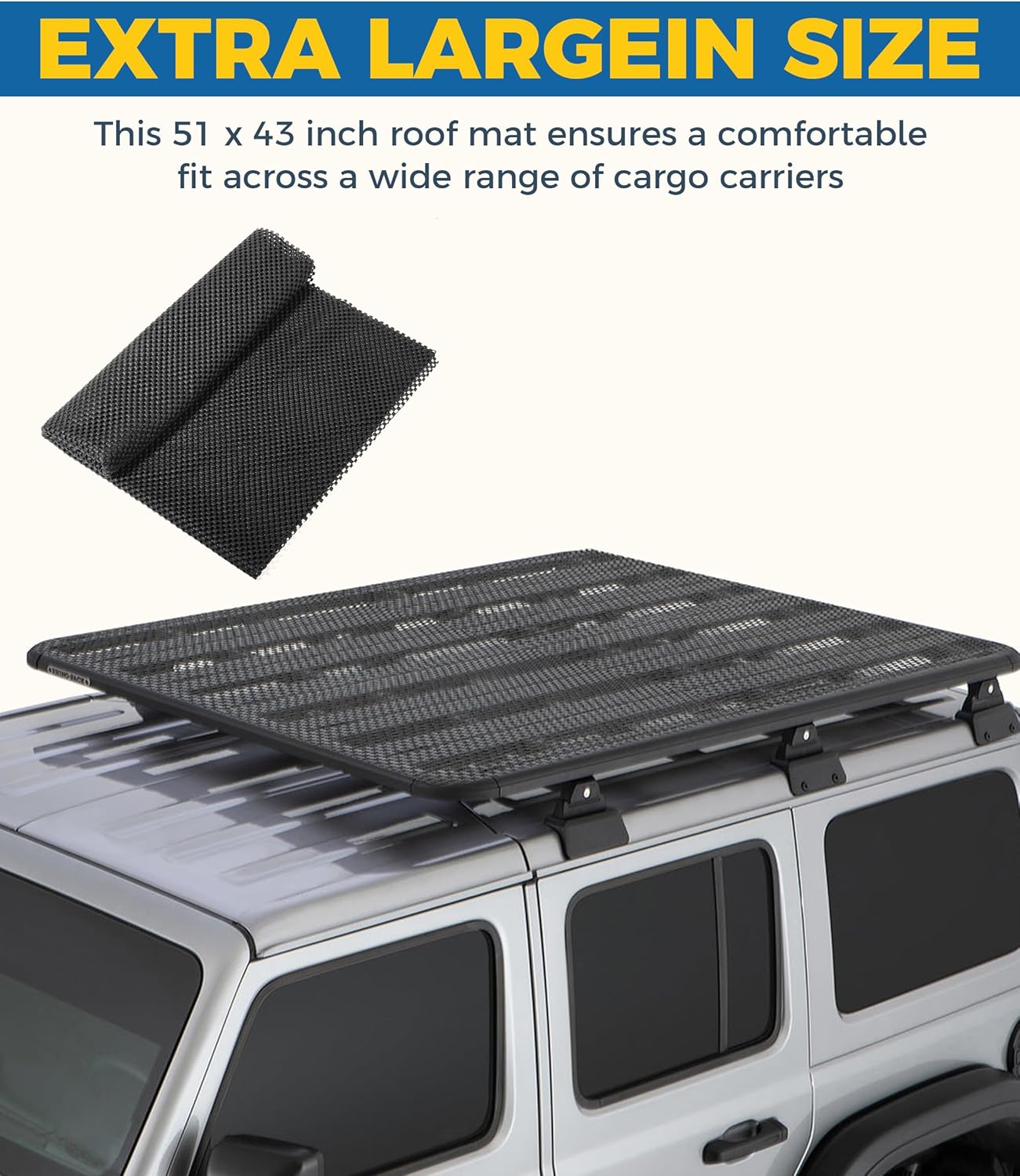 [Widely Applicable] The roof cargo bag protective mat measures 51 inches x 43 inches and is suitable for most vehicles. It can be cut to fit or folded for extra protection. It is perfect for use with roof racks and roof storage bags.