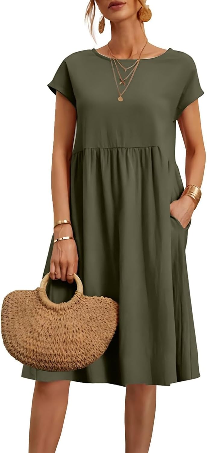 Baggy Crew Neck Dress for Women Casual Comfy Cotton Short Sleeve Tunic Beach Dresses with Pockets