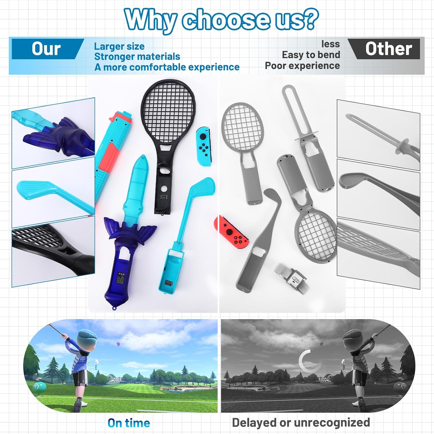 【More Realistic Gaming Experience】 This switch sports accessories also allows you to simulate a real tennis racket swing. Its golf clubs feature a safety belt design and a rotatable shaft design for a comfortable fit that is suitable for users of all ages. Sword’s chamfered design avoids accidental stabs, and you can easily press the ZR button for attack and defense. You can experience a variety of games such as tennis, golf, fencing, soccer, dance games and more.