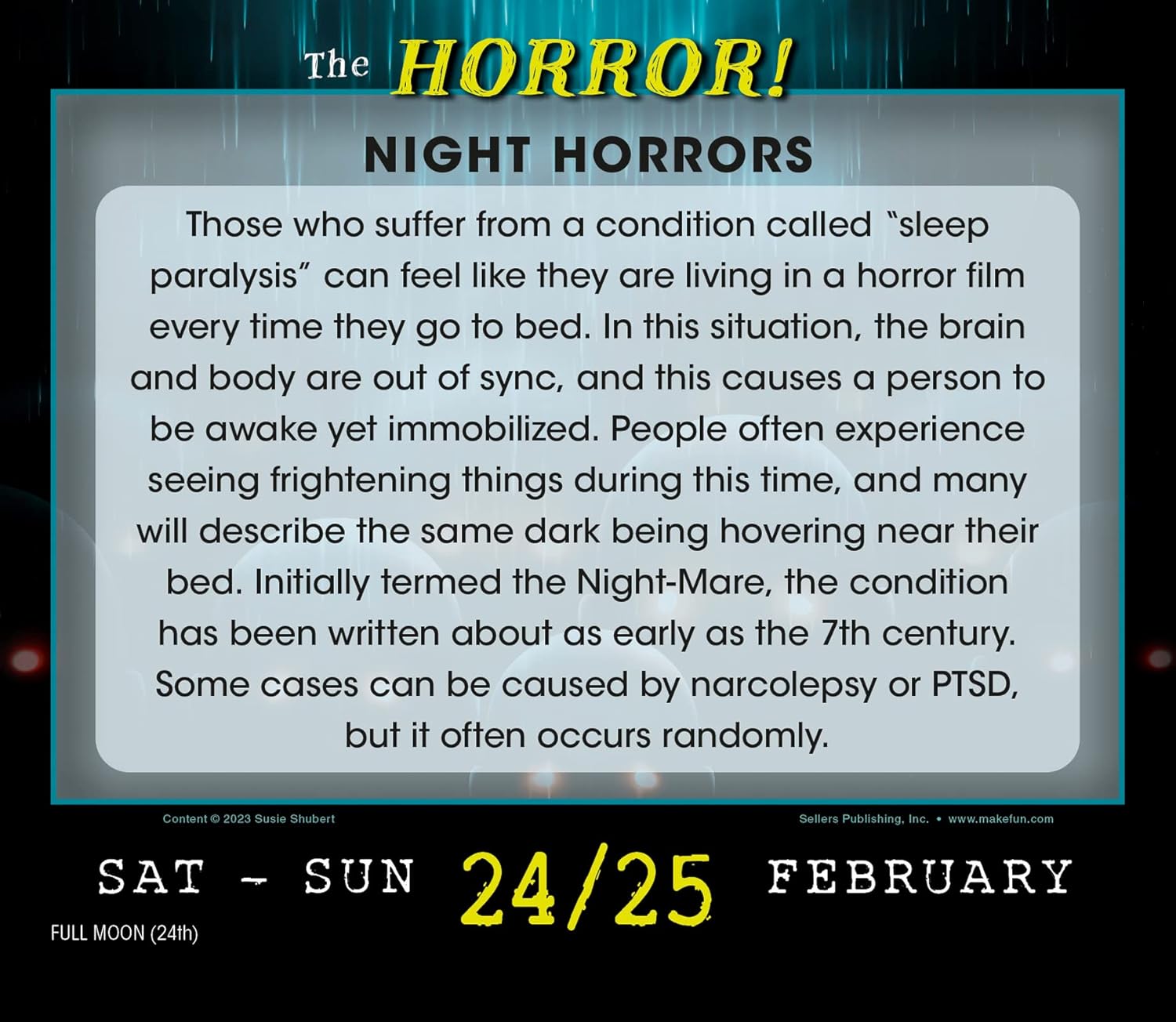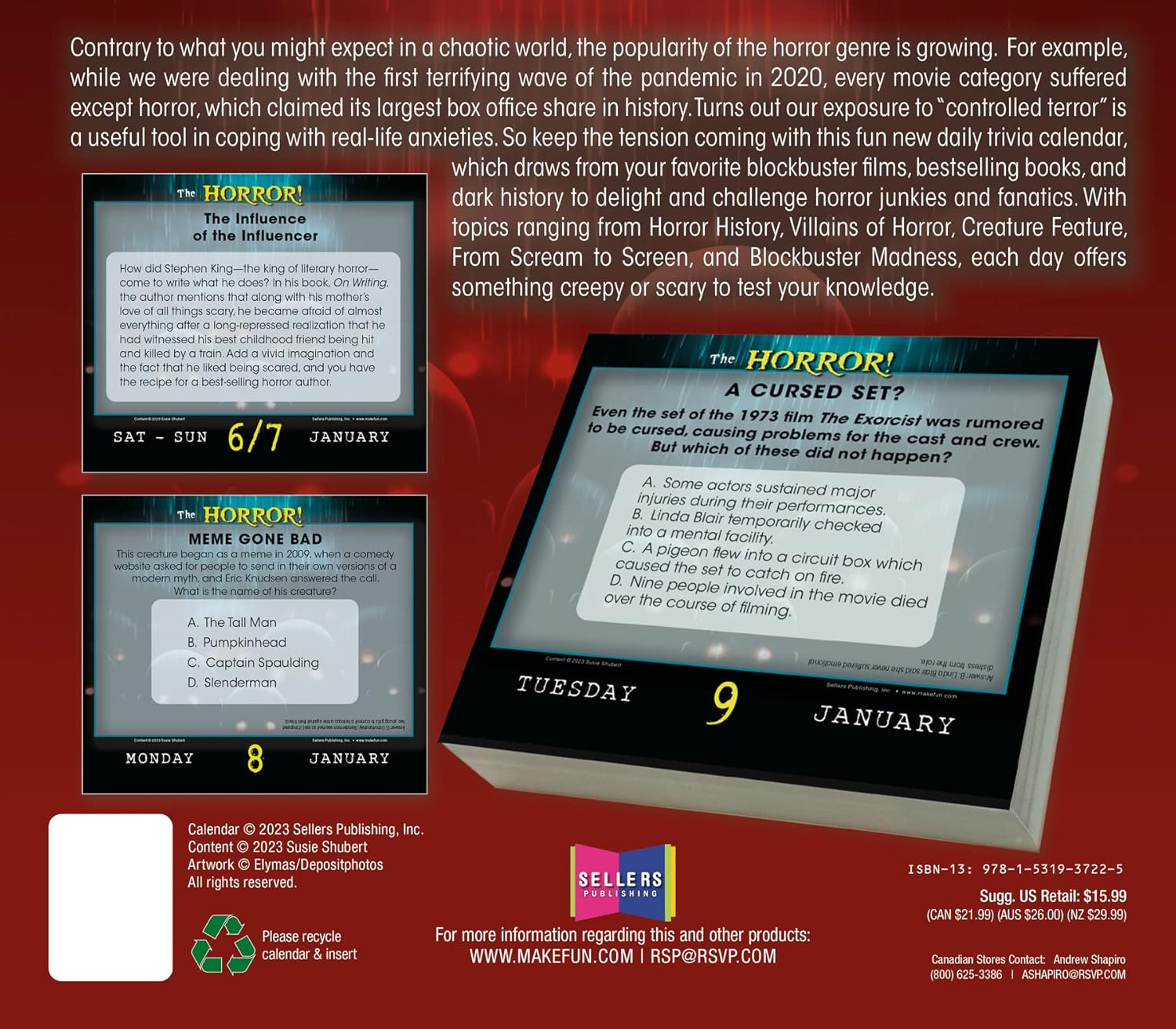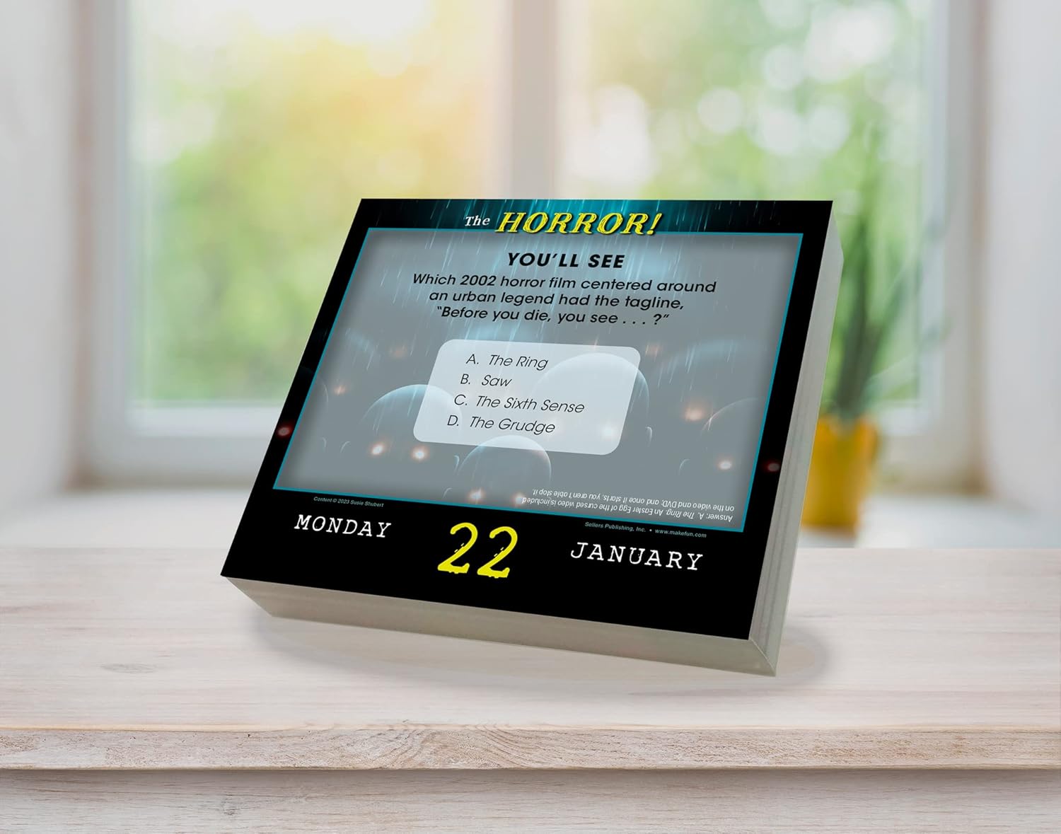 With topics from best-selling books to blockbuster films to horror history The Horror! Terrifying Trivia for Fright Fanatics trivia daily calendar offers something creepy or scary to test your knowledge every day of the year