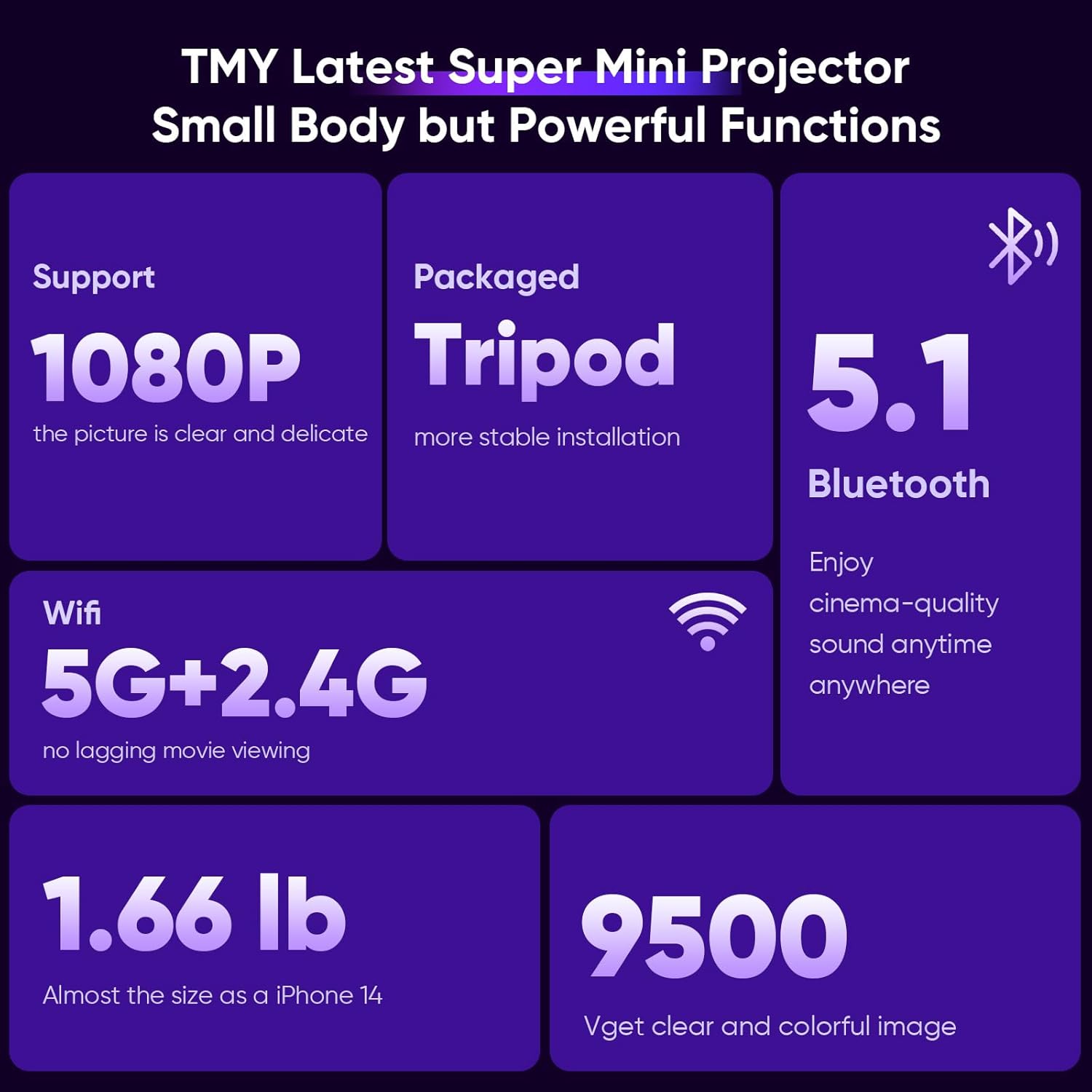 TMY Mini Projector for iPhone, Portable Projector with 5G WiFi and Bluetooth, 1080P HD Projector【with Tripod】, Movie Projector for iOS/Android/PC/TV Stick/HDMI/AV/USB, Indoor & Outdoor use