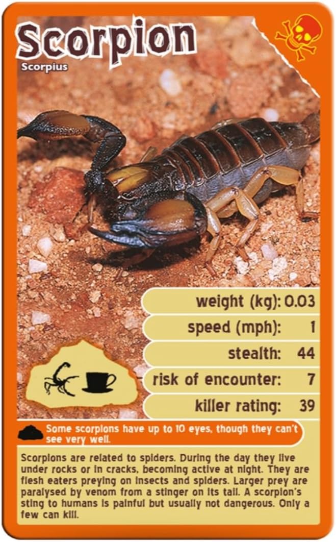 Find out how much a Great White Shark weighs, stealth of a Scorpion and the killer rating of an American Alligator in this edition of Top Trumps – Predators