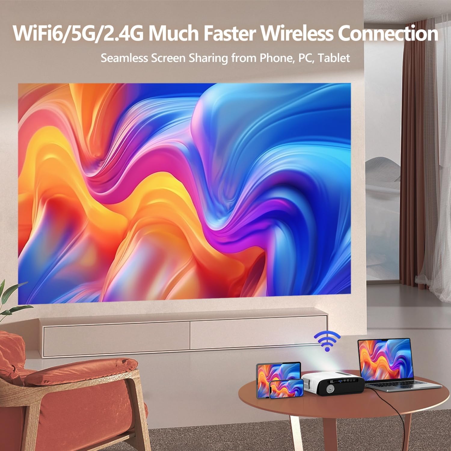 Home theater p【4K Projector & Newest WiFi 6】Featuring 1920*1080P native resolution and 4K for enhanced image precision and HD clarity. With OpenGL 3.2 and HDR10+, enjoy vibrant colors and lifelike visuals. Equipped with a powerful CPU and 2G+16G storage, along with dual-band Wi-Fi 6 capability, experience seamless wireless multi-screen sharing with no lag or delay. Utilizing advanced Wi-Fi mirroring technology, effortlessly sync your iPhone, iPad, Android phone, or tablet screens to a stunning 300” display.rojector