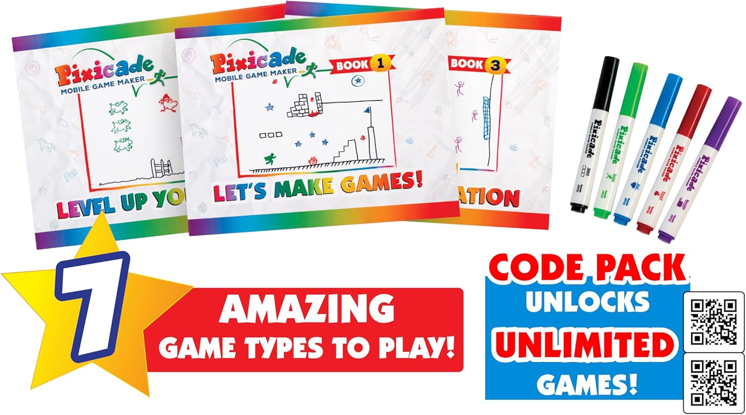 3 Activity Books Teach Game Design5 Washable Markers1 code to Unlock The App on One Device and Create Unlimited Games1 additional code to Unlock The App on a Second Device and Create Unlimited GamesInstructions/ Quick Start Guide