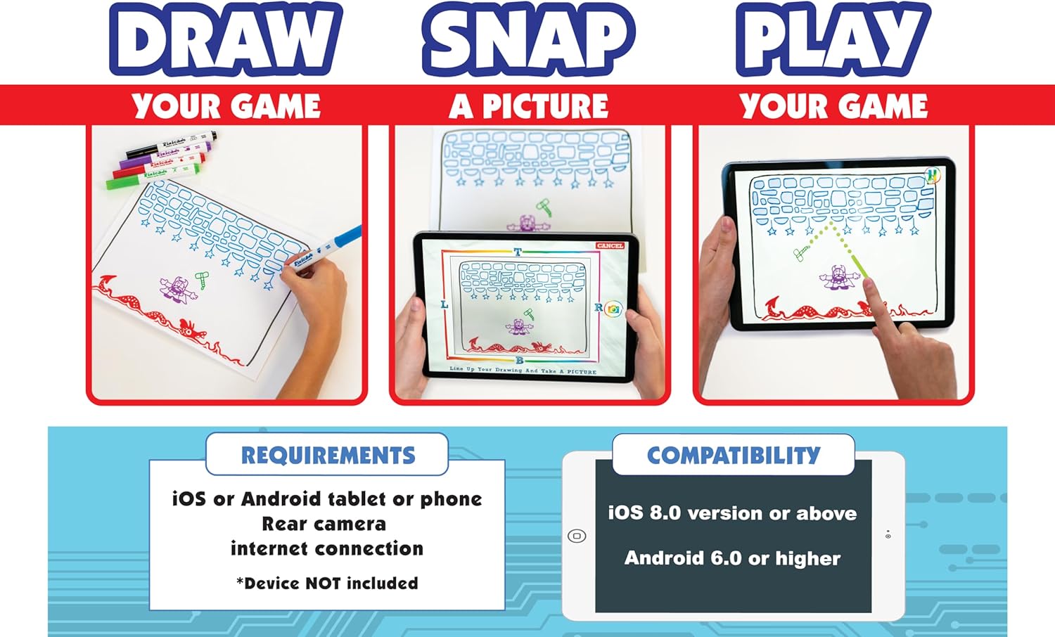 🍎 SURPRISINGLY SIMPLE AND EASY-TO-USE! Simply draw your game on paper, snap a pic of it, and then play an animated version on your phone or tablet! Create your own character, build obstacles for them to overcome, and design the goal for how to win the game! This is a game you will feel good having your kids play for hours at a time