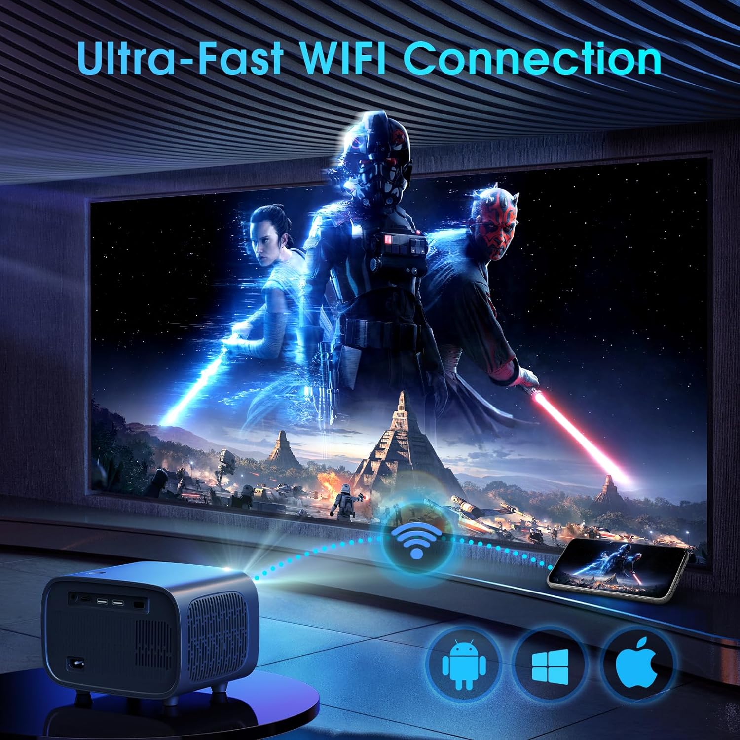 [Ultra-Fast WiFi & Bluetooth 5.2] VIKEYUNVK projector with wifi and bluetooth. The latest WIFI connection function is compatible with IOS, Android and Windows systems, and you can enjoy a low-latency same-screen experience (same-screen can also be achieved through cables). Bluetooth 5.2 brings lower latency and stable connection with Bluetooth speakers, Bluetooth headsets and other devices
