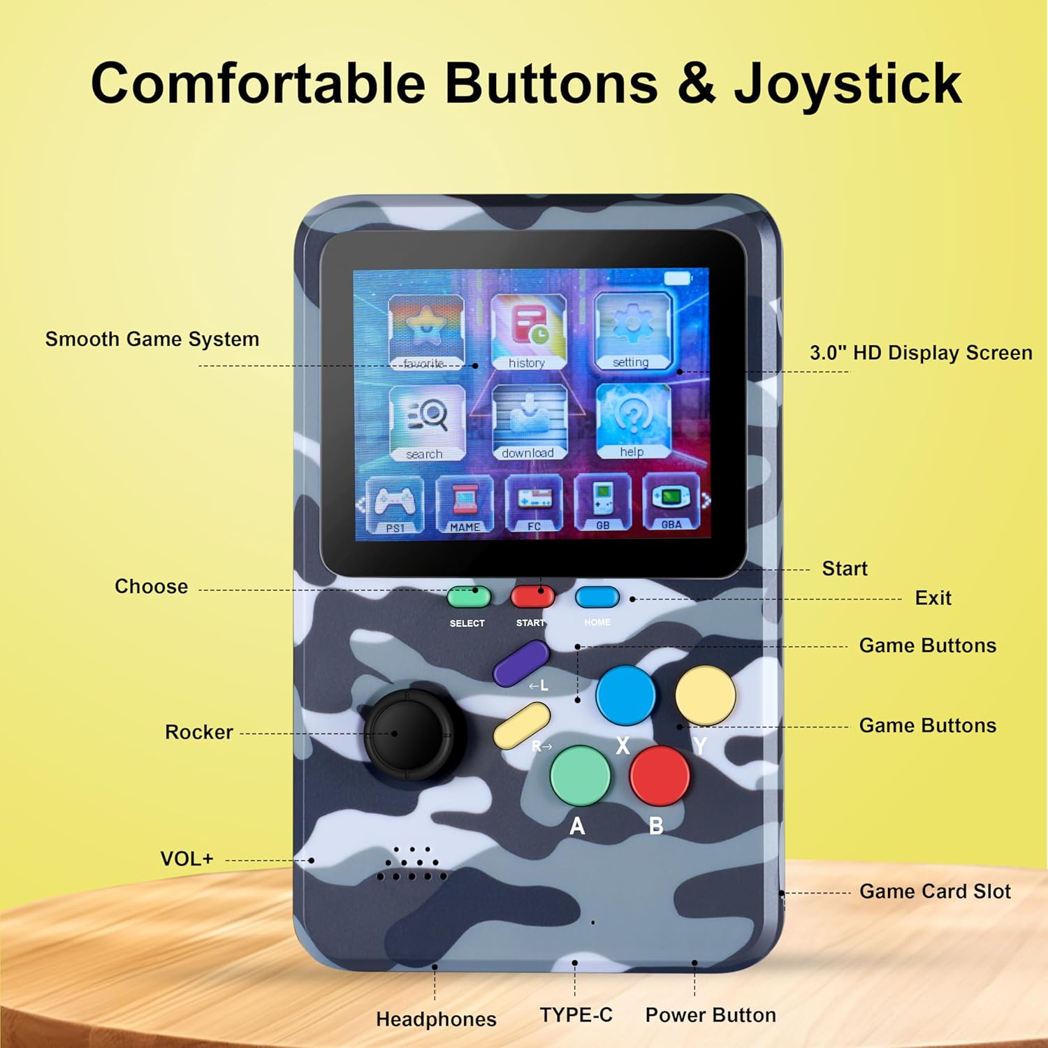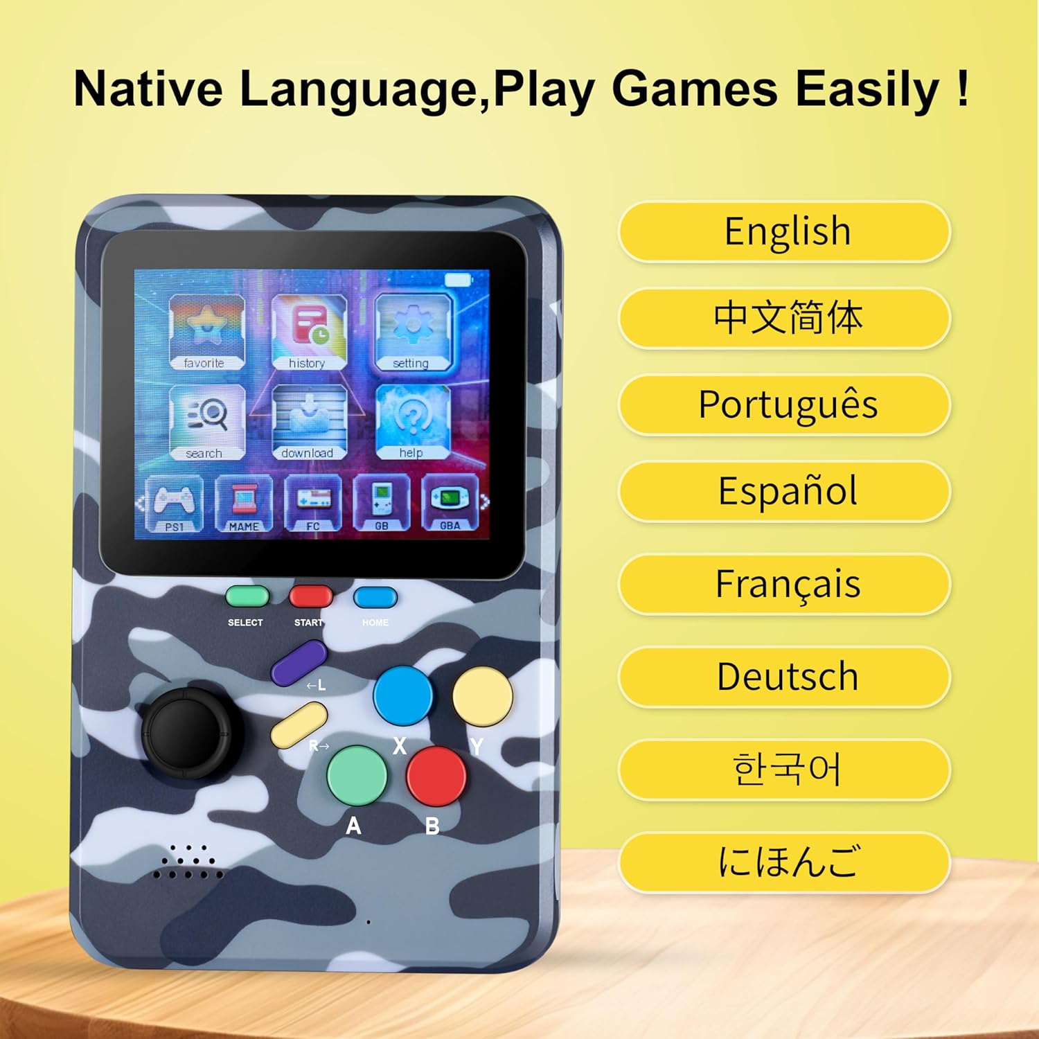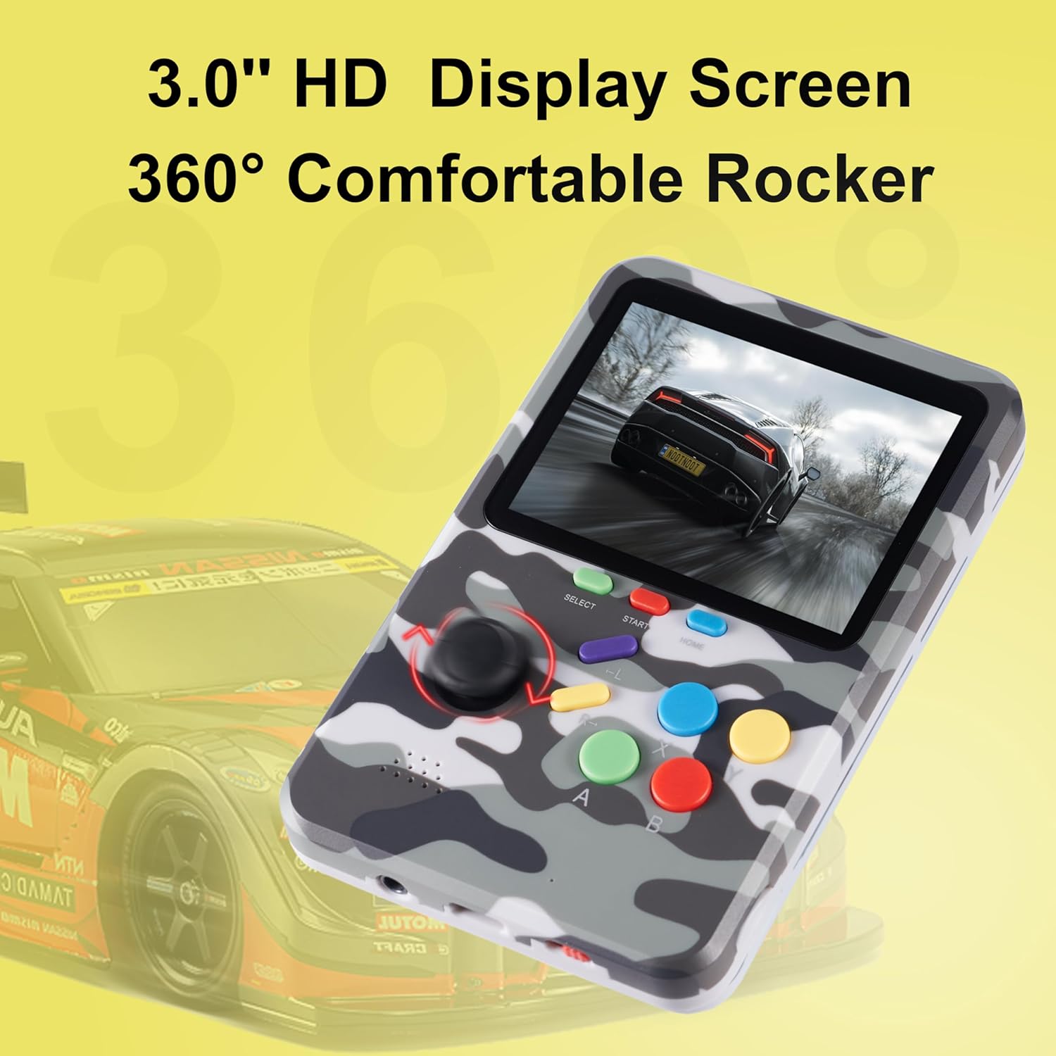 Great Gaming Experience : Our retro game console has ergonomic 360°rocker & comforable game button,3.0 inch HD screen and stereo speaker.Upgrated handheld emulator with native language.It can pasue or save games,so you can continue your game without starting over.All for a better game experience !