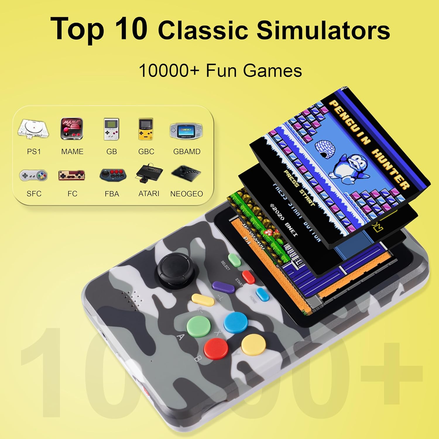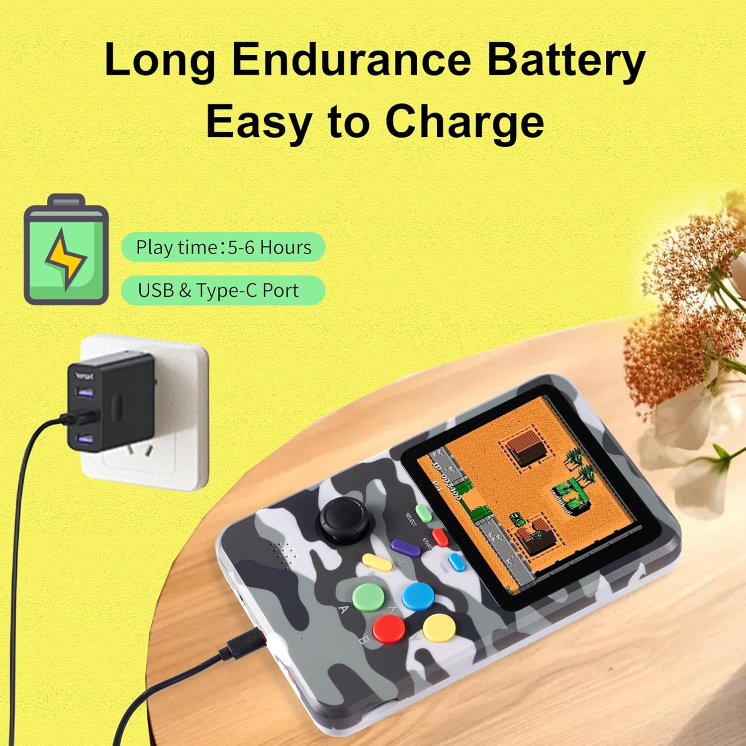 Compact & Portable : Our retro handheld game console has palm size,built-in 1500mAh Li-Ion rechargeable battery which ensures 5~6 hours playing time while on the go or on a trip.Enjoy retro emulator console games whenever you want!