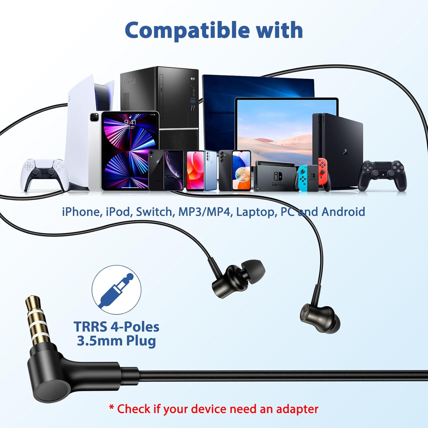 90° Angled Plug: Wired earphones with 90° angled 3.5mm TRRS plug, perfectly fit your laptops, computers, cellphones or device with a 3.5mm aux port, no fear of bending or breakage plug while enjoy music, games or chatting