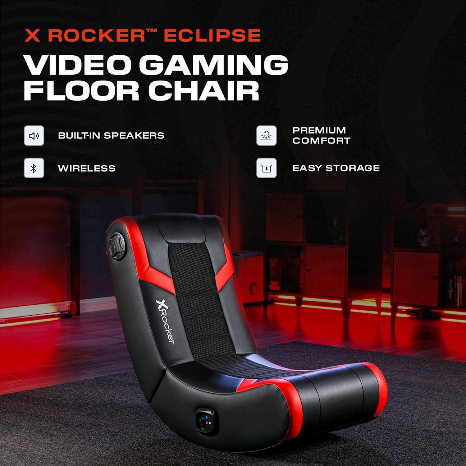 Teens and adults alike can now not only hear the game but feel them with the X Rocker Eclipse Floor Rocker! This high-tech chair features headrest mounted speakers to make you feel like you’re actually inside of the game. The versatile chair is compatible with both old and new gaming systems such as PS5, Xbox Series X/S, and Nintendo Switch through the 3.5mm port on the controller, as well as Xbox One and PlayStation 4 through a wired connection to the controller if port available, or through a wired connection to the TV. Enjoy video games, movies, music, and more! Best fit for mobile and console gaming and intended display on TV or mobile. The compact rocking design moves and reclines to provide comfortable playing positions throughout your longest gaming sessions. The sleek black and silver design brings a modern look to your office, living room, game room, bedroom, or dorm room. Measuring 31″ x 16.5″ x 27.5″, this chair also folds down for convenient storage when not in use.
