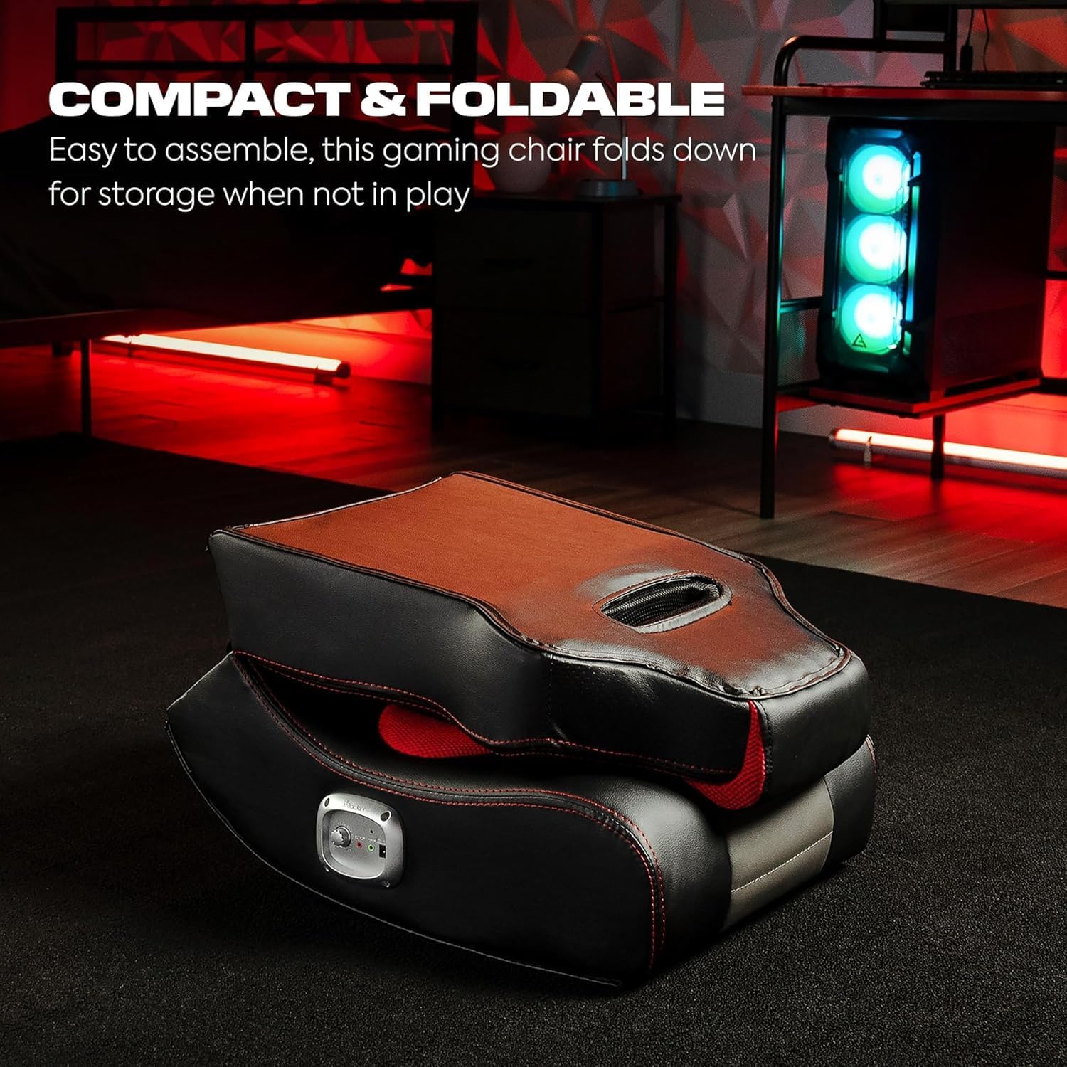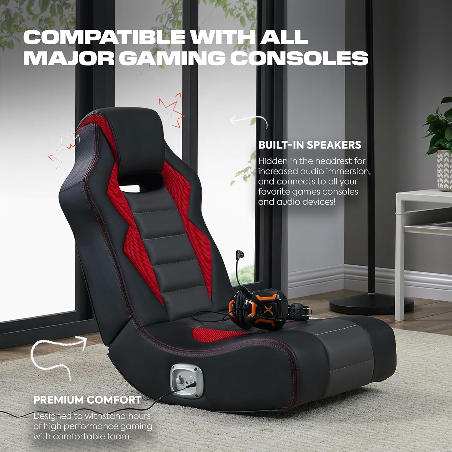 X Rocker Flash Floor Rocker Video Gaming Chair, Headrest Mounted Speakers, Integrated 2.0 Wired Audio System, Black, Gray, and Red