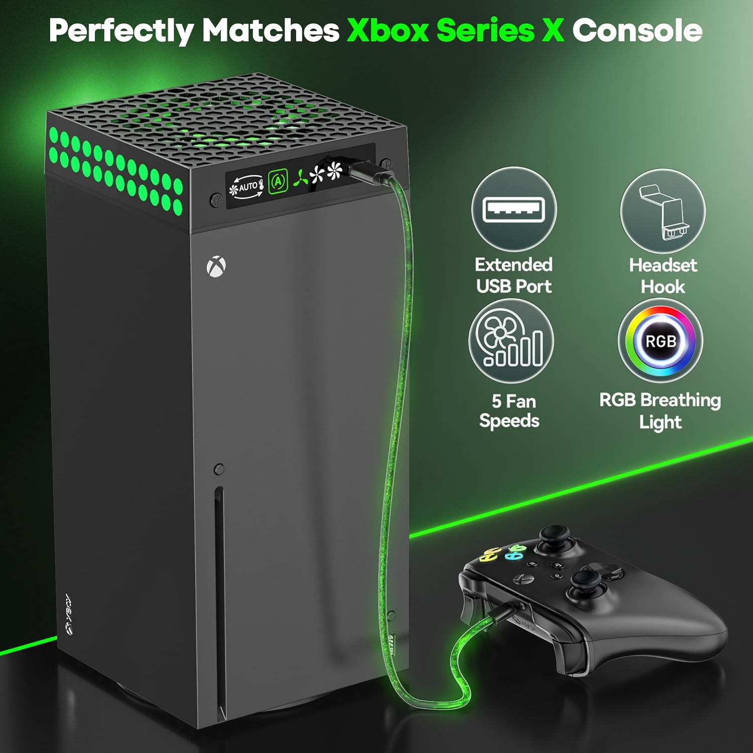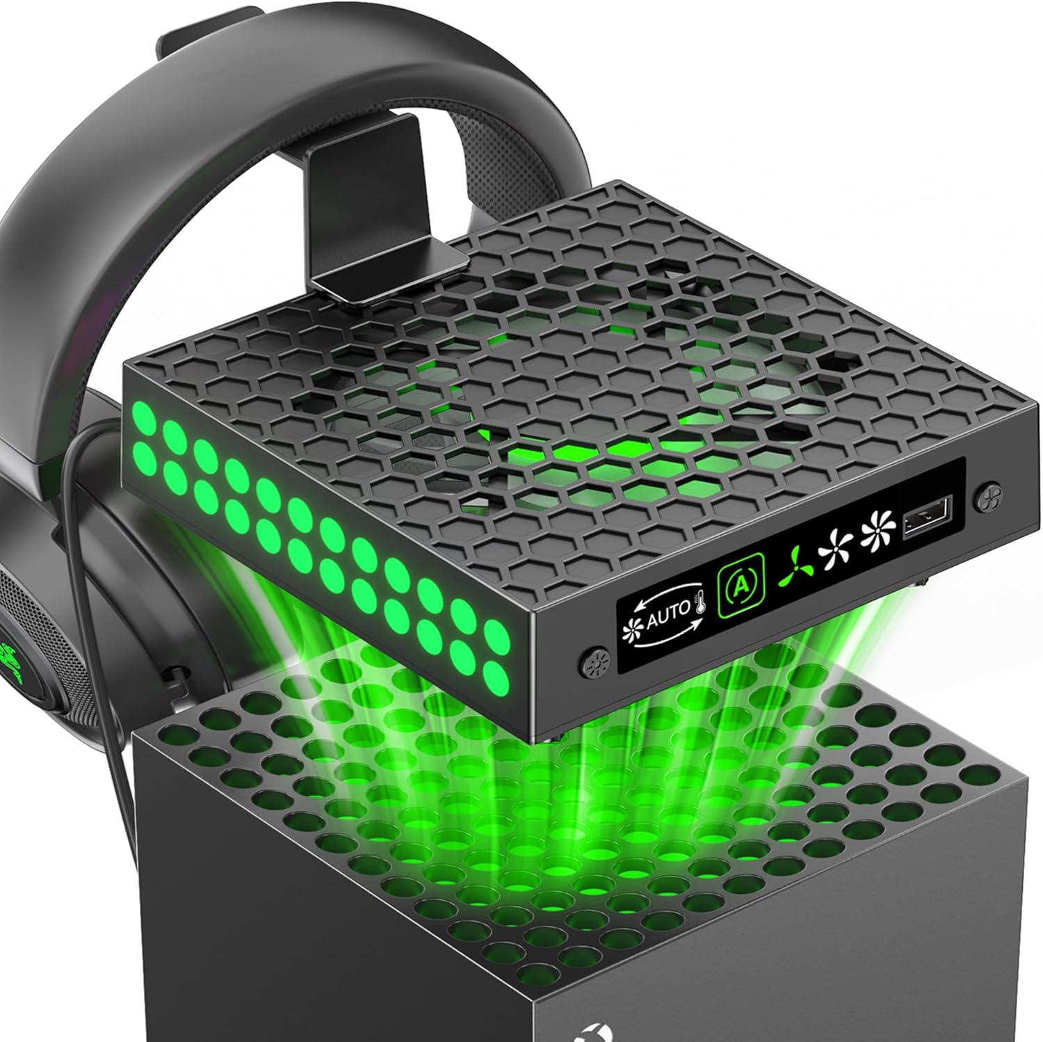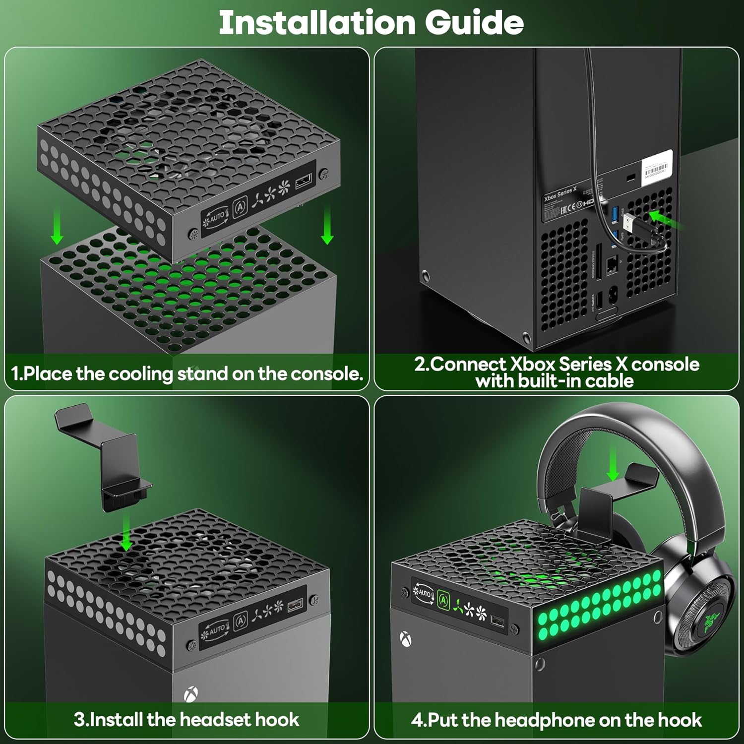 Very Easy to Set Up: You can install xbox series x cooling system in just 1 minute. First, align xbox fan with the top of your Xbox Series X console and place xbox x fan securely. Next, plug built-in cable into USB port to power xbox series x fan, ensuring your Xbox Series X is powered on. Then, insert the included headphone hook into the top and hang your headphones. The perfect integrated design provides all the extra functionality you need, keeping your xbox gaming setup neat and organized.