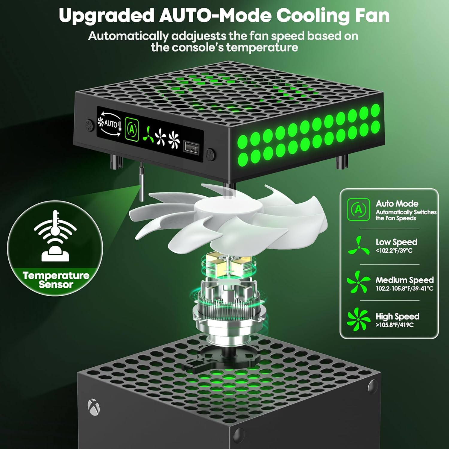 5 Adjustable Fan Speeds: Xbox series x cooling fan offers 5 adjustable speeds: Auto, Low, Medium, High, and Off, which you can switch between using Fan button. When you select the Auto mode, the system will automatically adjust fan speed for you. Here’s how it works: if xbox series x console temperature exceeds 105.8°F, xbox cooling fan switches to High. If xbox console temperature is between 102.2°F and 105.8°F, xbox cooler switches to Medium. If xbox console temperature drops below 102.2°F, xbox cooling switches to Low. You can also manually adjust the fan speed to suit your preferences.